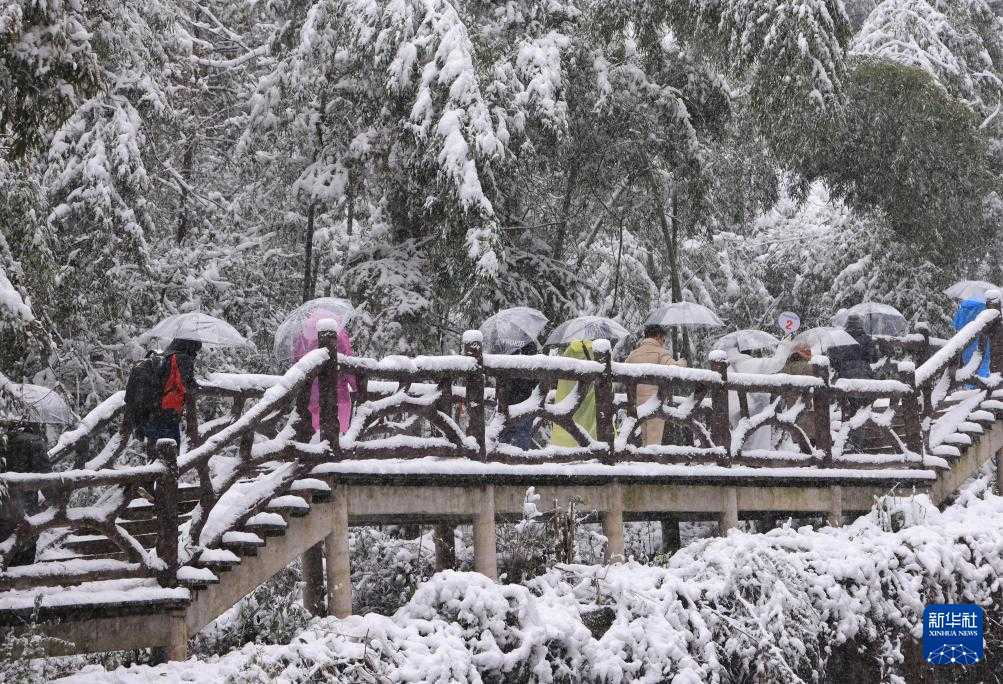 1月22日,游人在张家界市武陵源宝峰湖景区赏雪游玩。(图源:新华社)