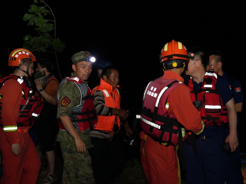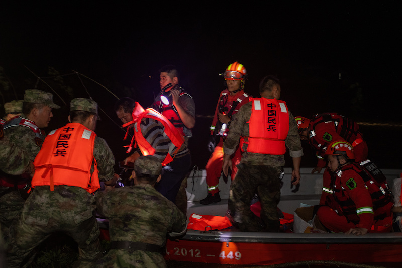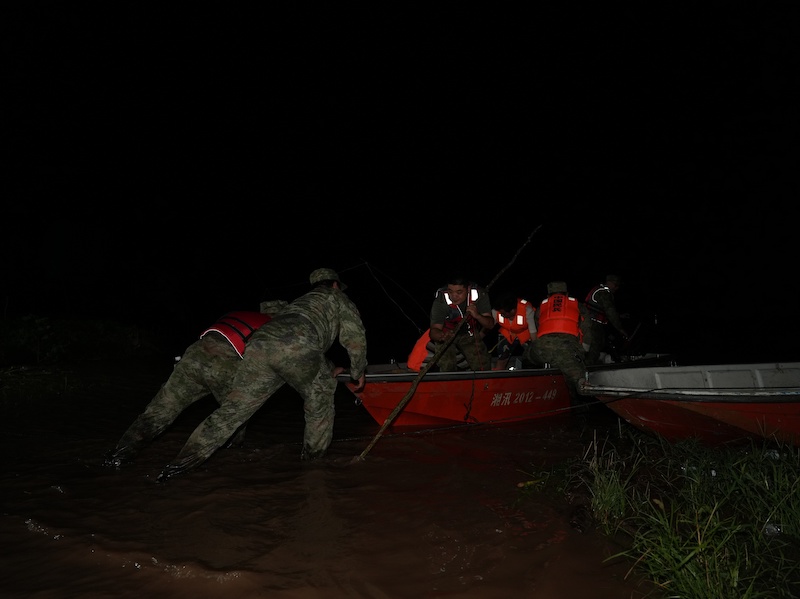 图片说明:7月5日晚,岳阳军分区官兵和民兵们驾驶冲锋舟在溃口下游区域进行搜救。图为接应从被淹民房中成功转移的受困群众。岳阳军分区供图