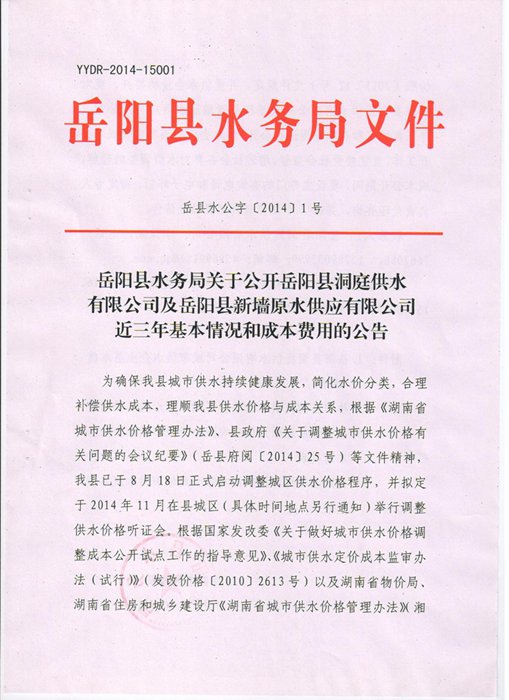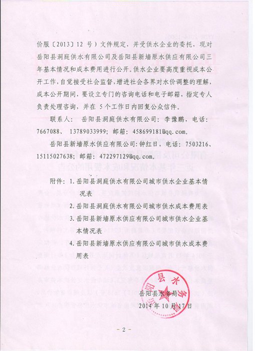 岳阳县洞庭供水有限公司及岳阳县新墙原水供应有限公司近三年基本情况和成本费用公告