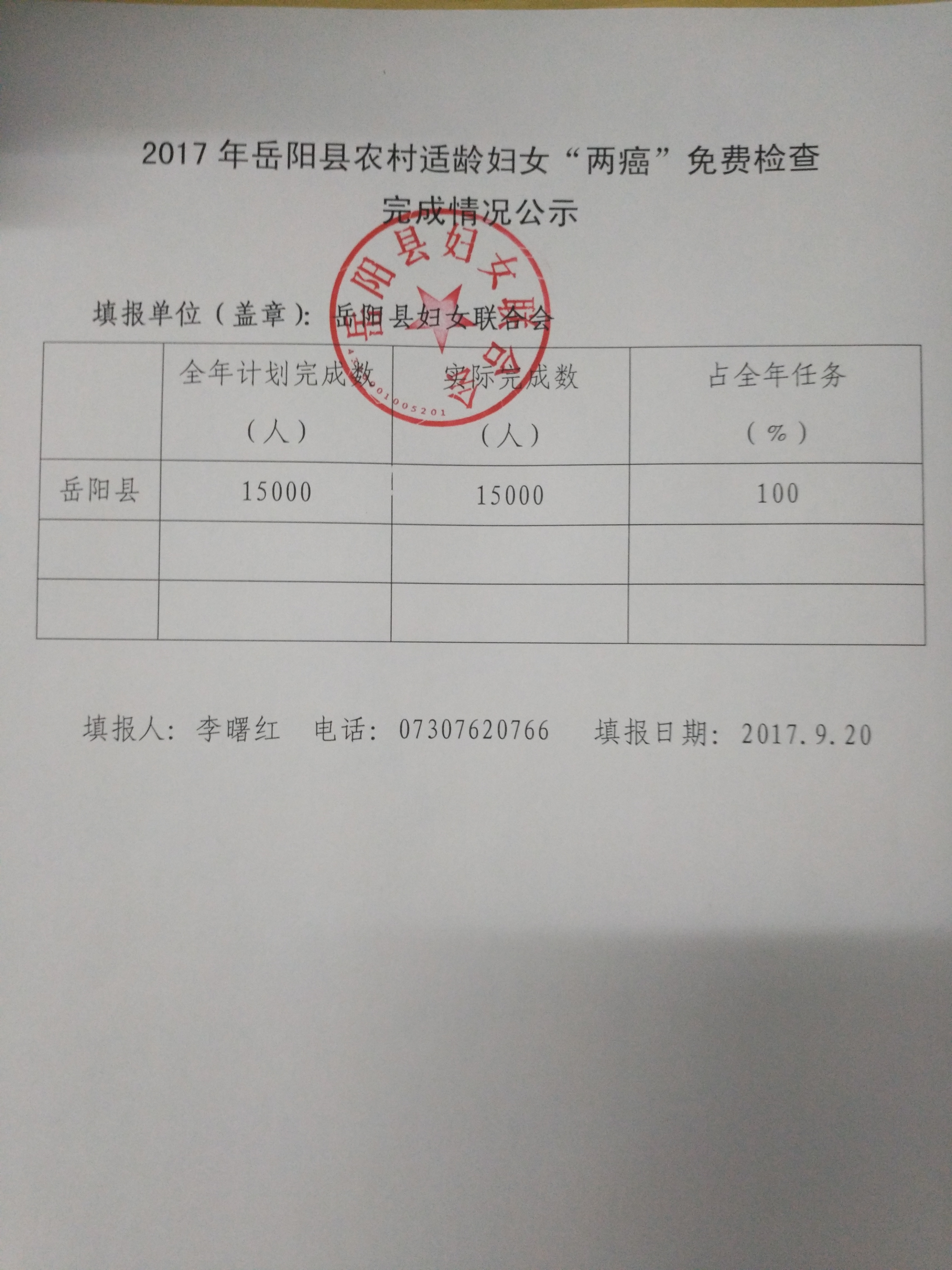 2017年岳阳县农村适龄妇女“两癌”免费检查完成情况公示