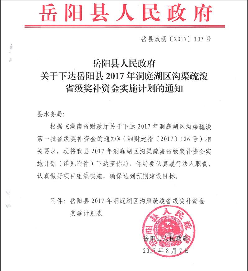 附:岳阳县人民政府(岳县政函[2017]107号)《关于下达岳阳县2017洞庭湖区沟渠疏浚省级奖补资金实施计划的通知》