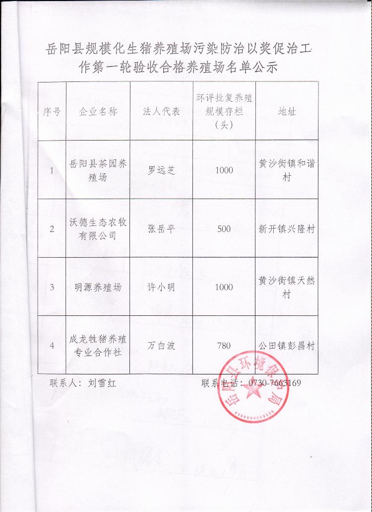 岳阳县规模化生猪养殖场污染防治以奖促治工作第一轮验收合格养殖场名单公示
