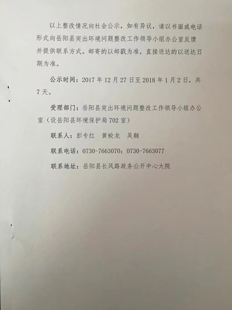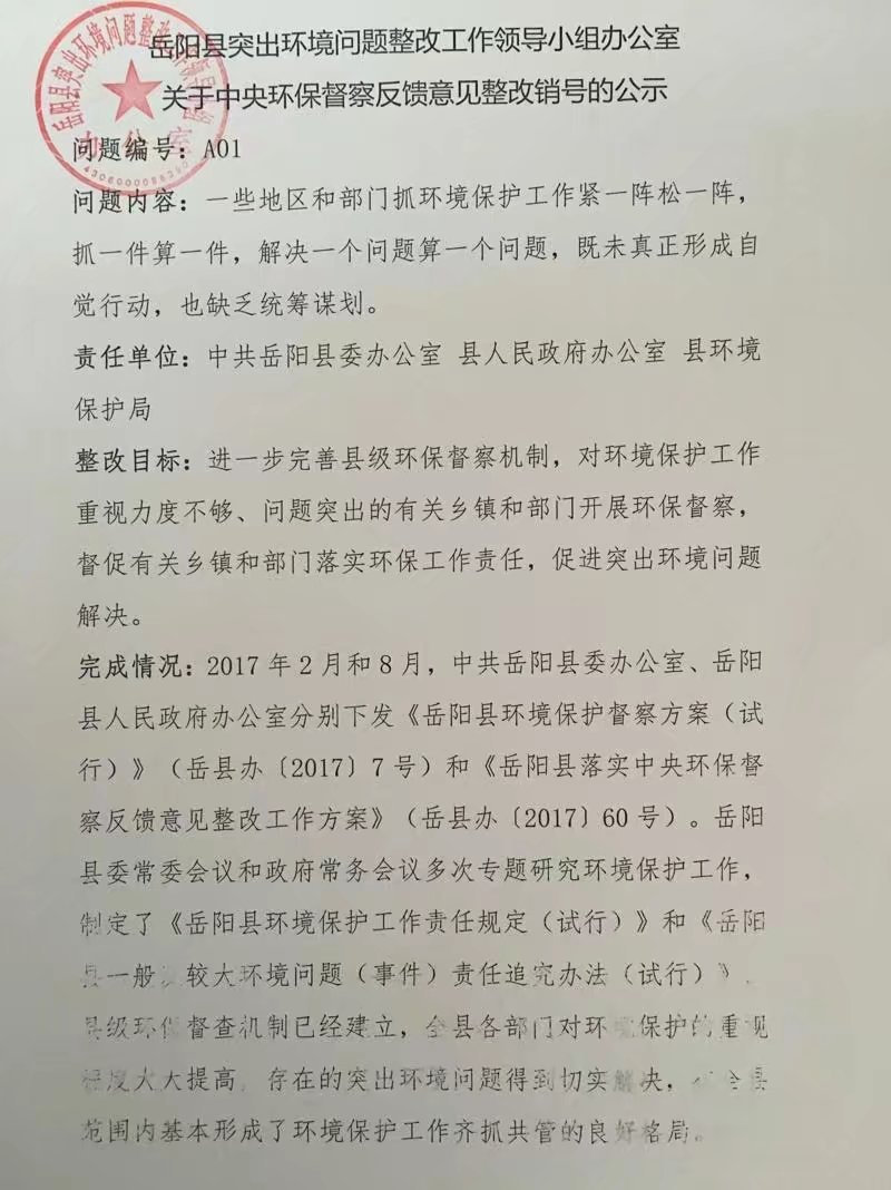 岳阳县突出环境问题整改工作领导小组办公室关于中央环保督察反馈意见整改销号的公示A01