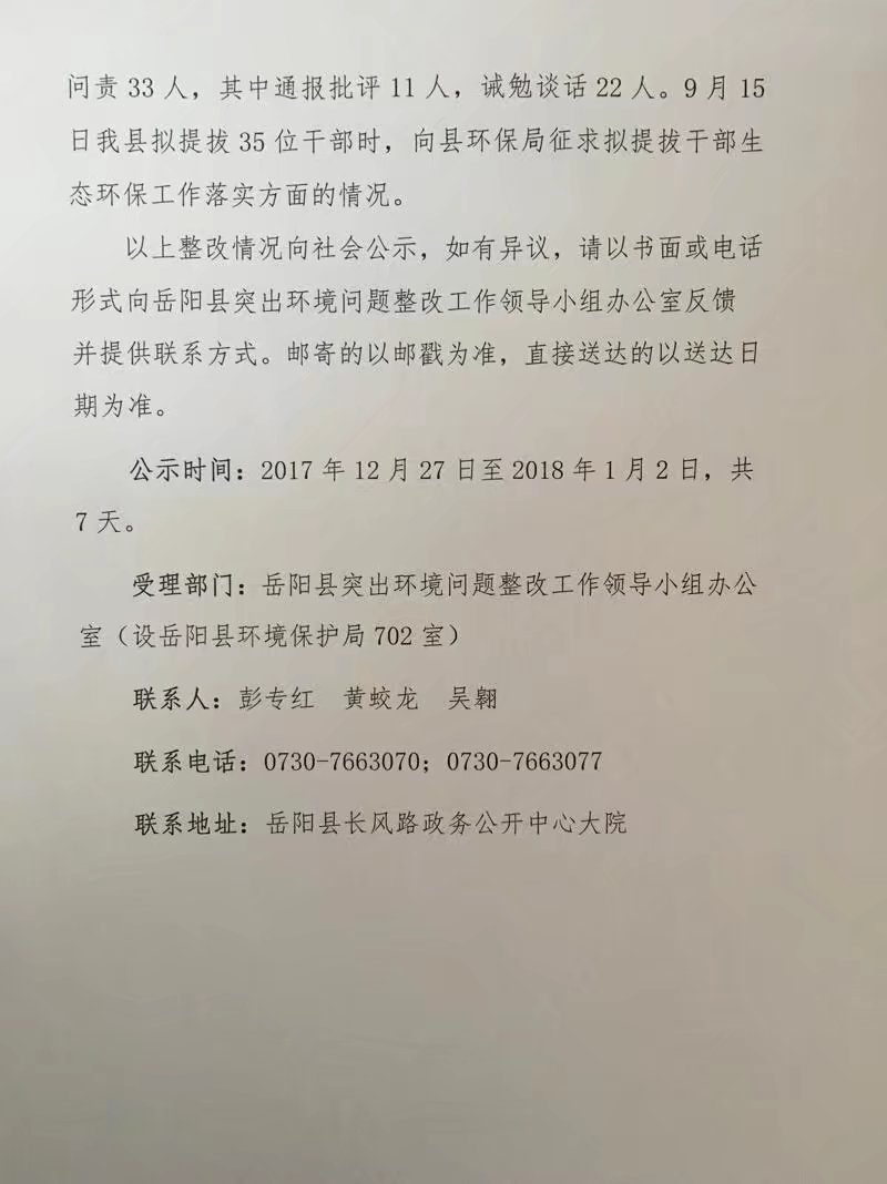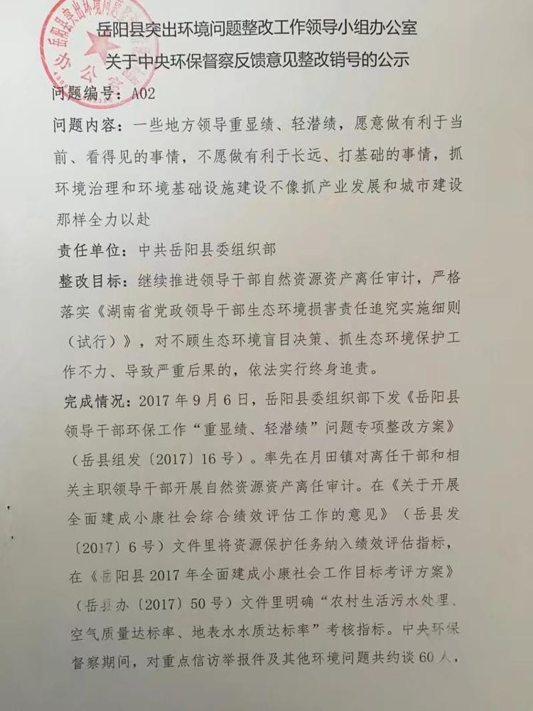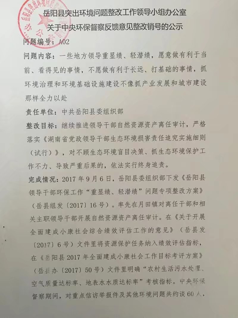 岳阳县突出环境问题整改工作领导小组办公室关于中央环保督察反馈意见整改销号的公示A02