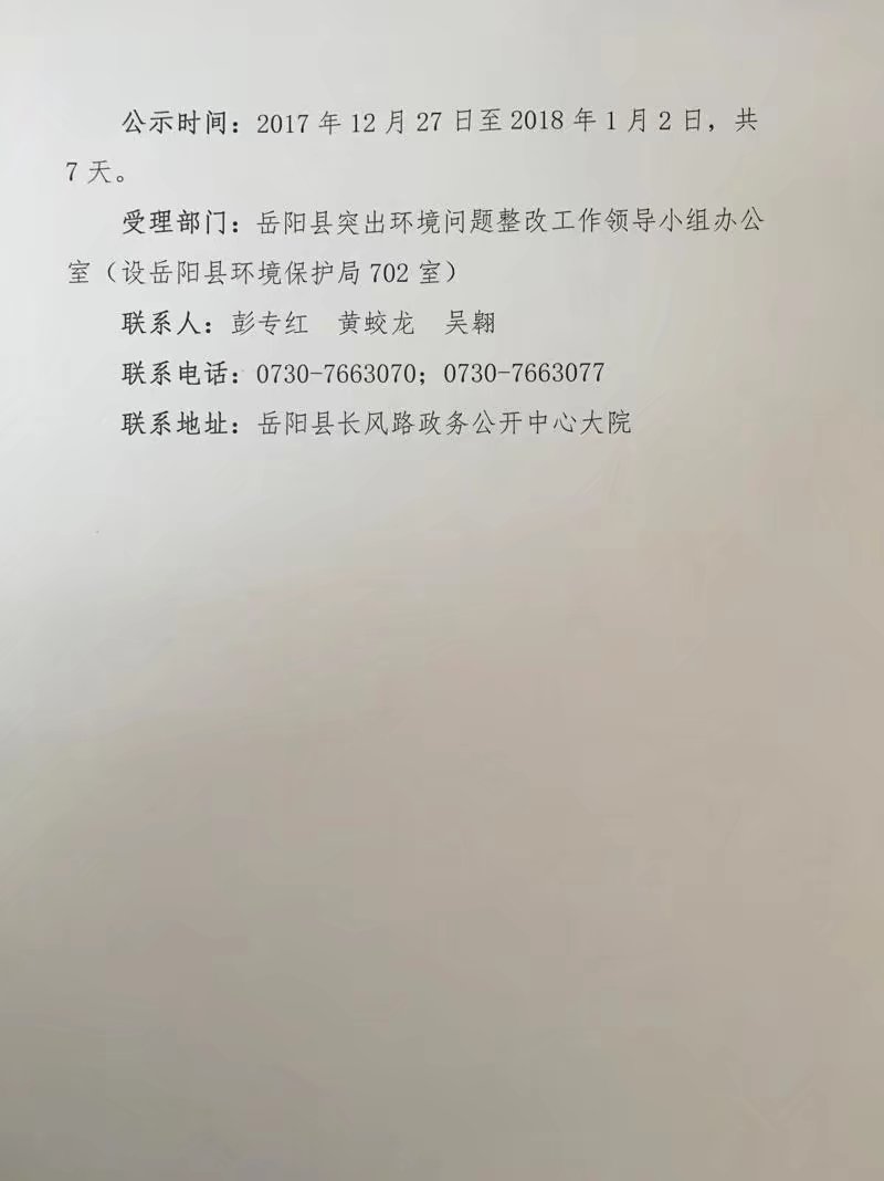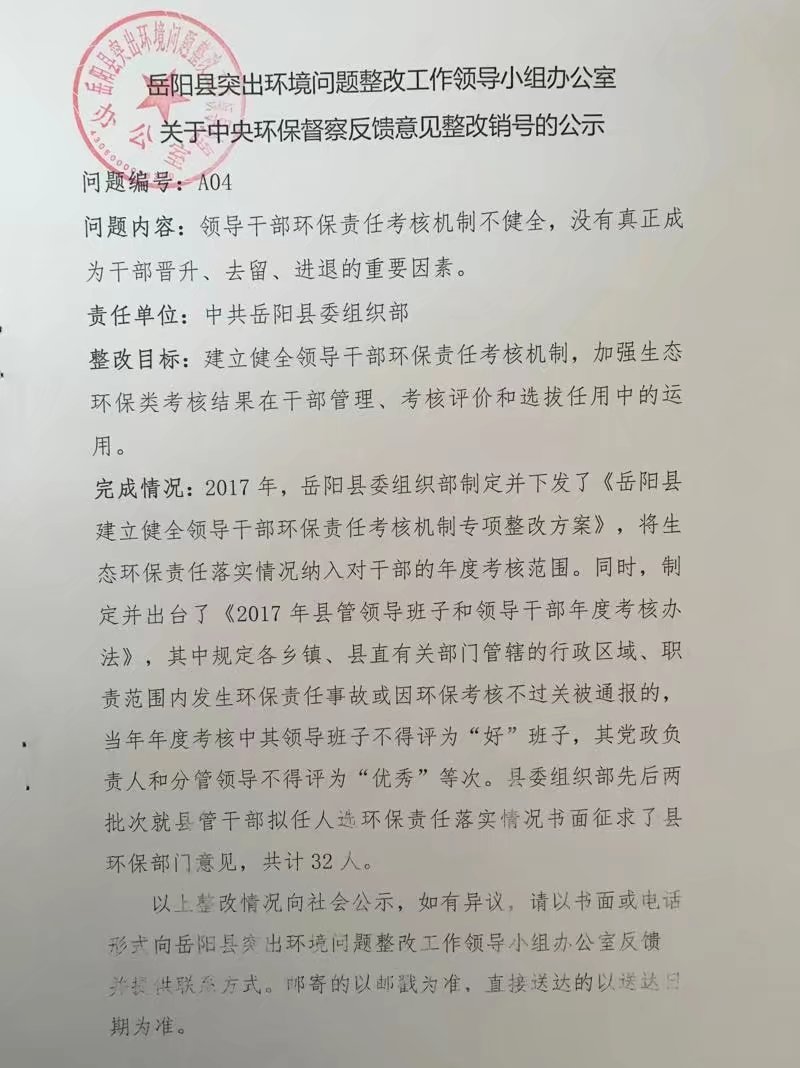 岳阳县突出环境问题整改工作领导小组办公室关于中央环保督察反馈意见整改销号的公示A04