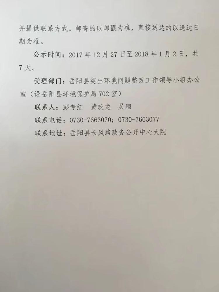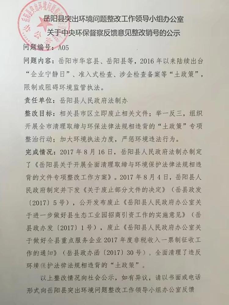 岳阳县突出环境问题整改工作领导小组办公室关于中央环保督察反馈意见整改销号的公示A05