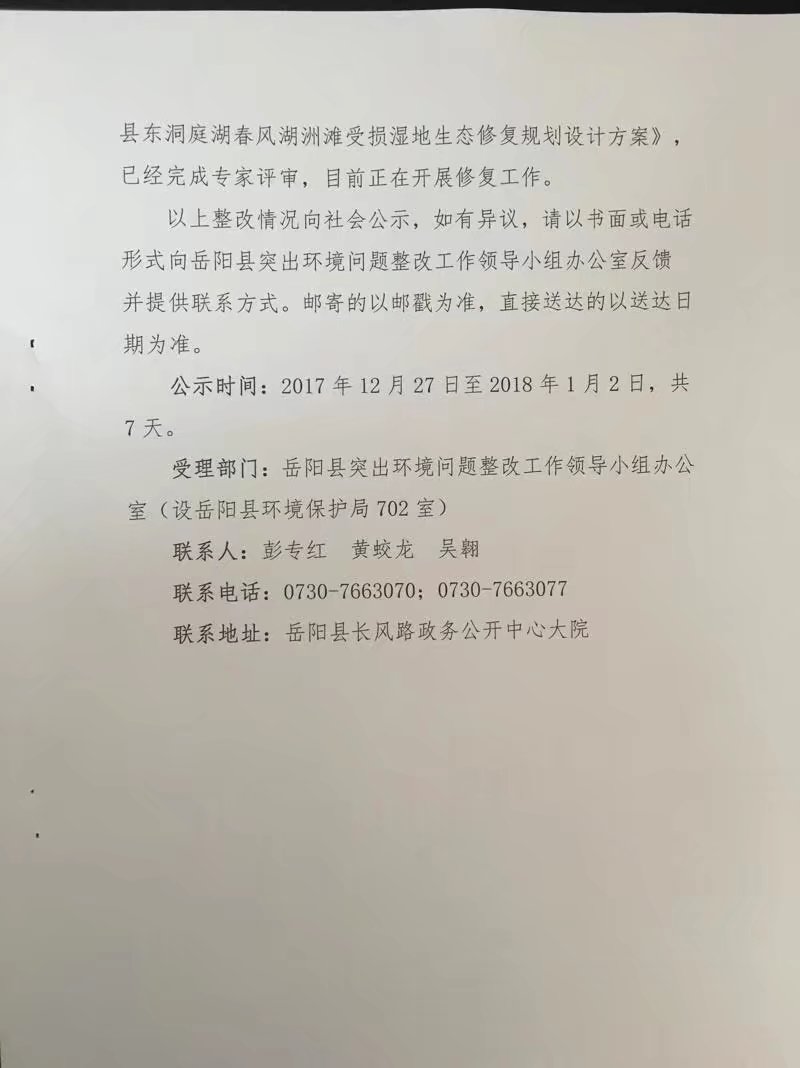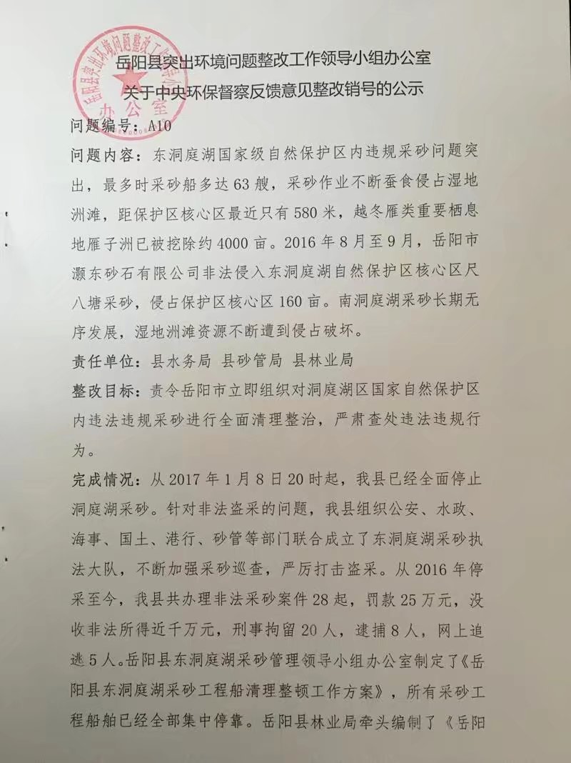 岳阳县突出环境问题整改工作领导小组办公室关于中央环保督察反馈意见整改销号的公示A10