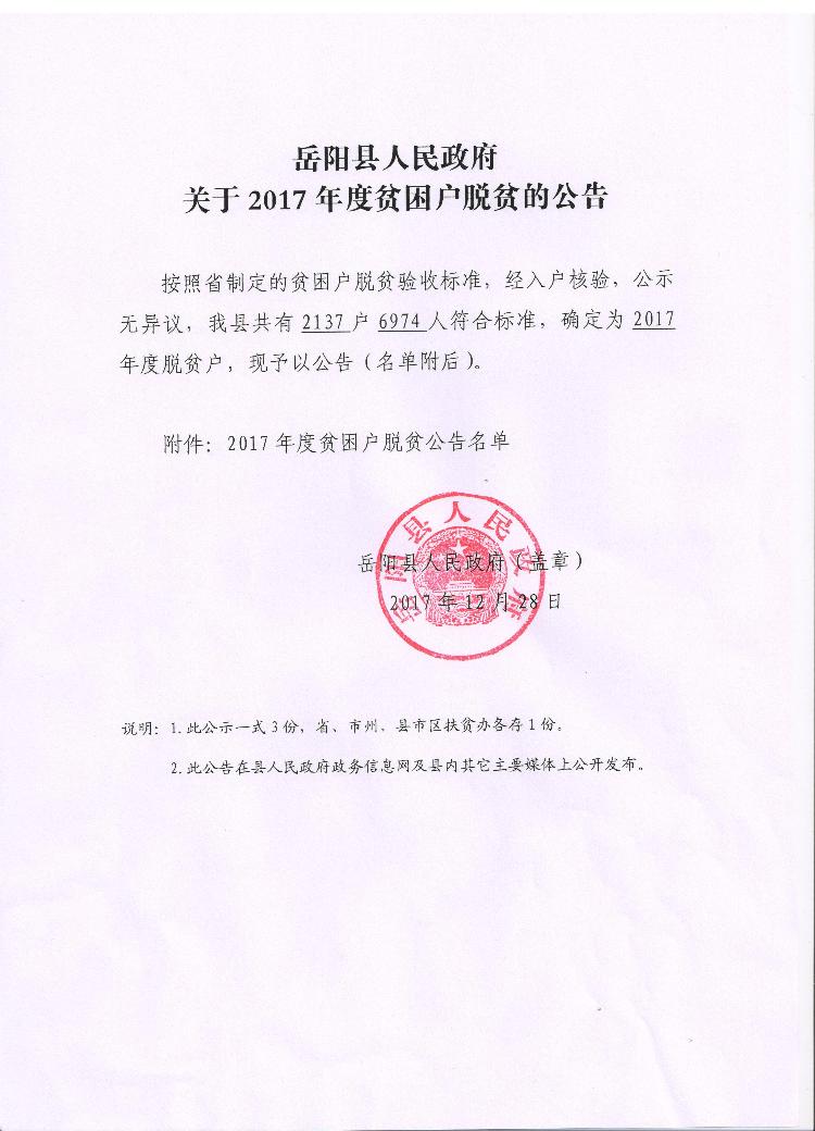 岳阳县人民政府关于2017年度贫困户脱贫的公告