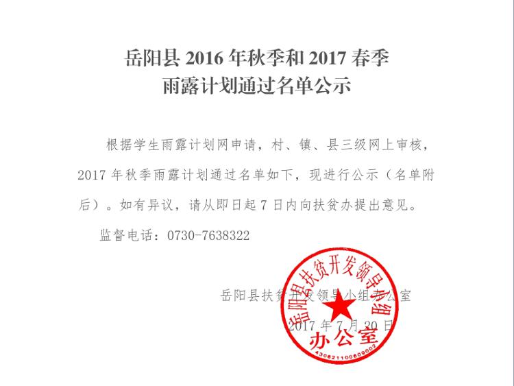 岳阳县2016年秋季和2017年春季雨露计划通过名单公示