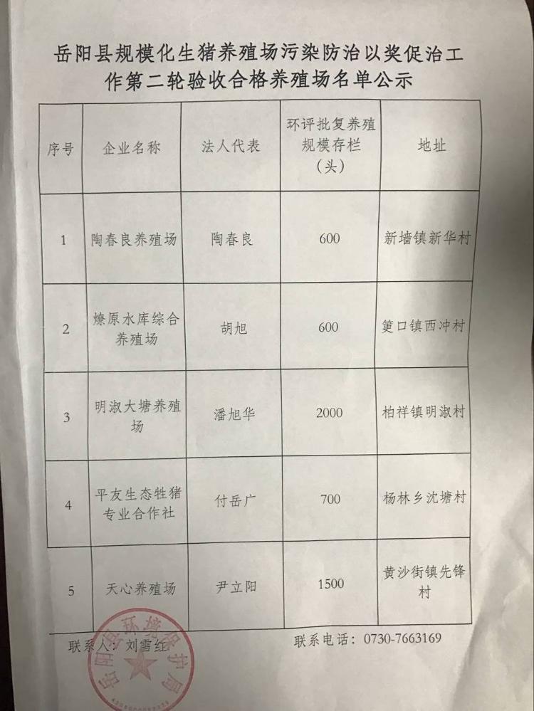 岳阳县规模化生猪养殖场污染防治以奖促治工作第二轮验收合格养殖场名单公示