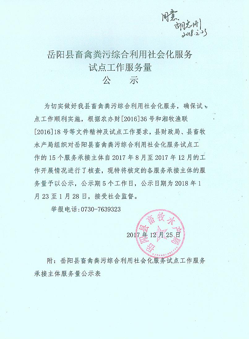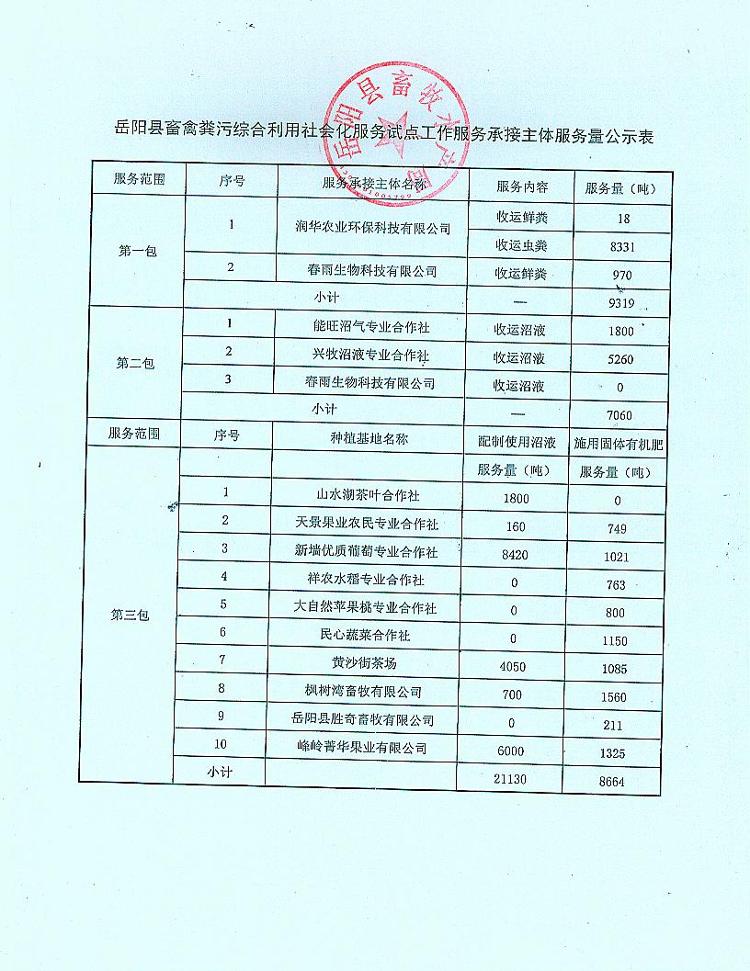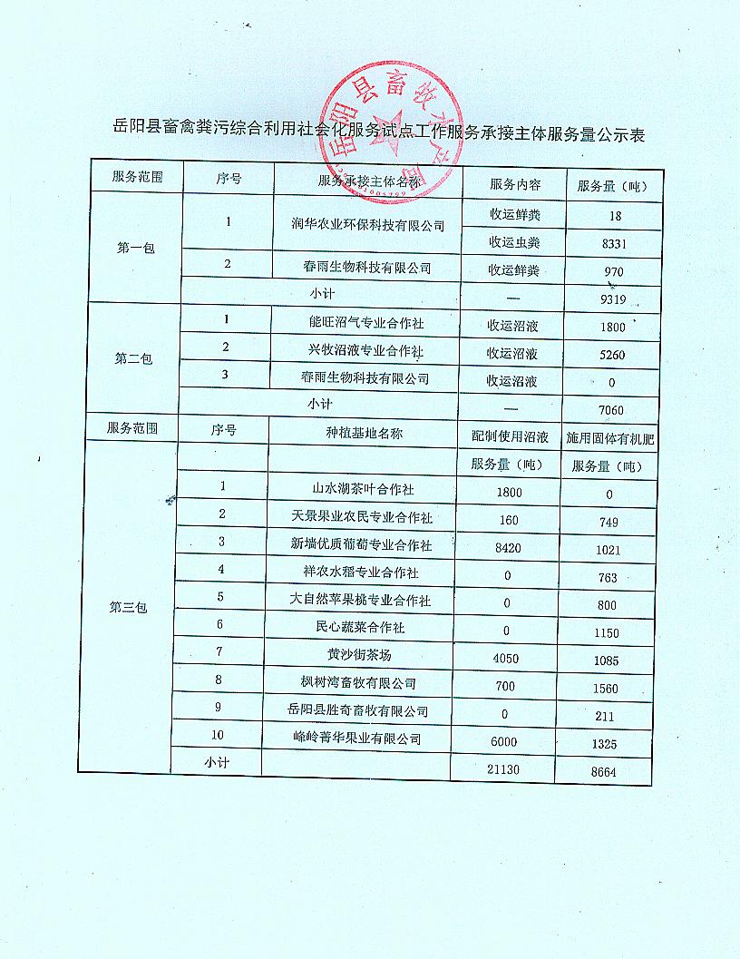 岳阳县畜禽粪污综合利用社会化服务试点工作服务量公示2