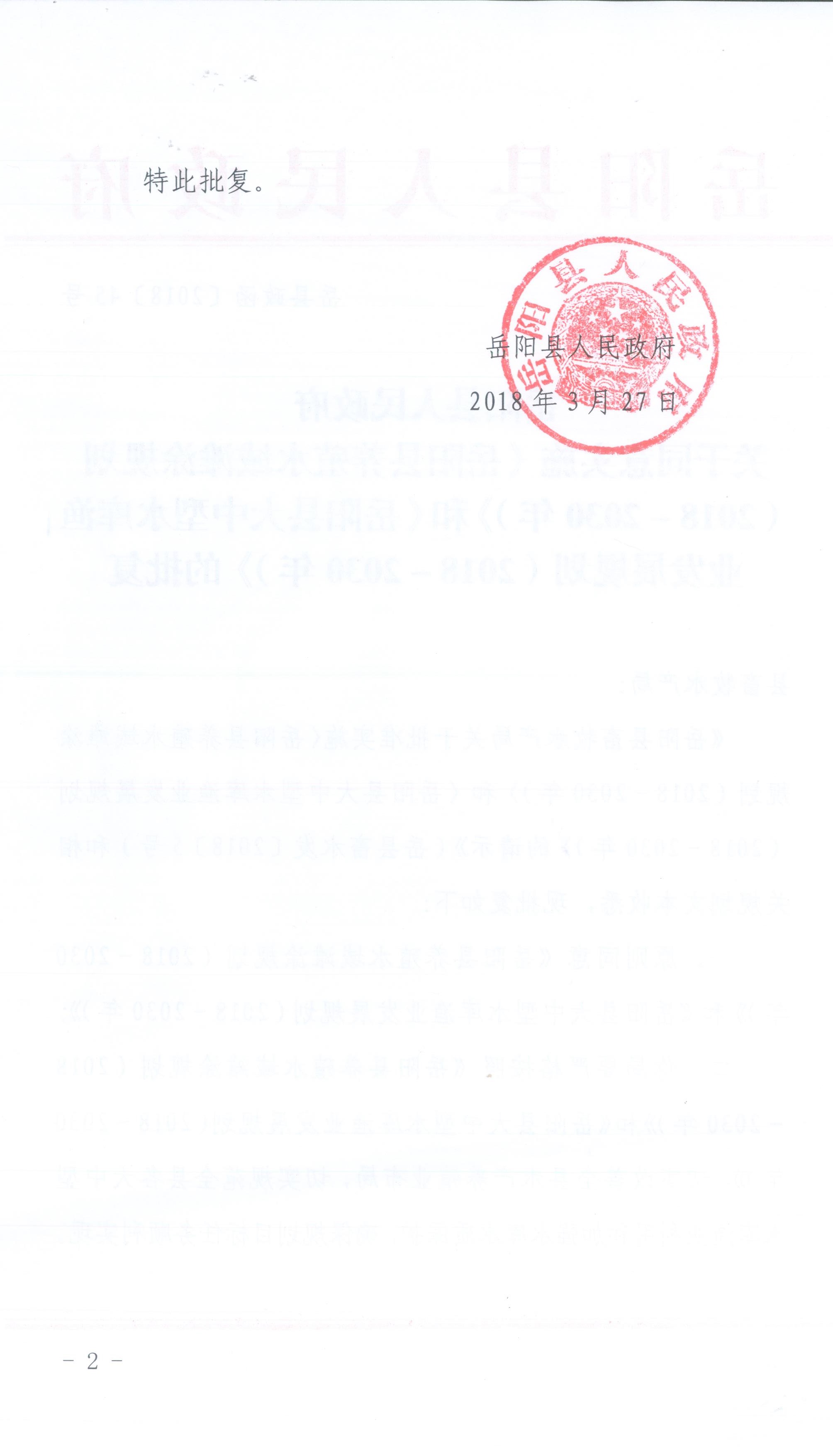 岳阳县人民政府关于同意实施《岳阳县养殖水域滩涂规划(2018-2030)》和《岳阳县大中型水库渔业发展规划(2018-2030年)》的批复