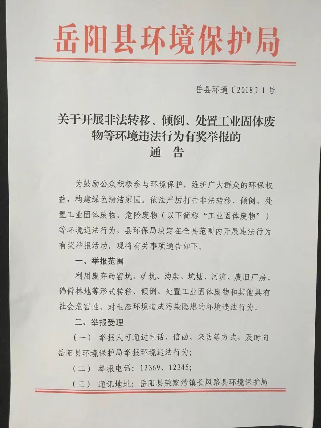 关于开展非法转移、倾倒、处置工业固体废物等环境违法行为有奖举报的通告