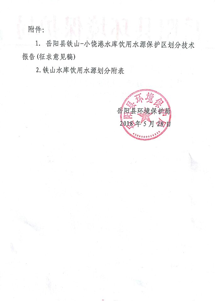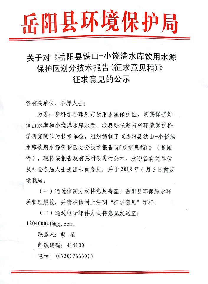 关于对《岳阳县铁山-小饶港水库饮用水源保护区划分技术报告(征求意见稿)》征求意见的公示