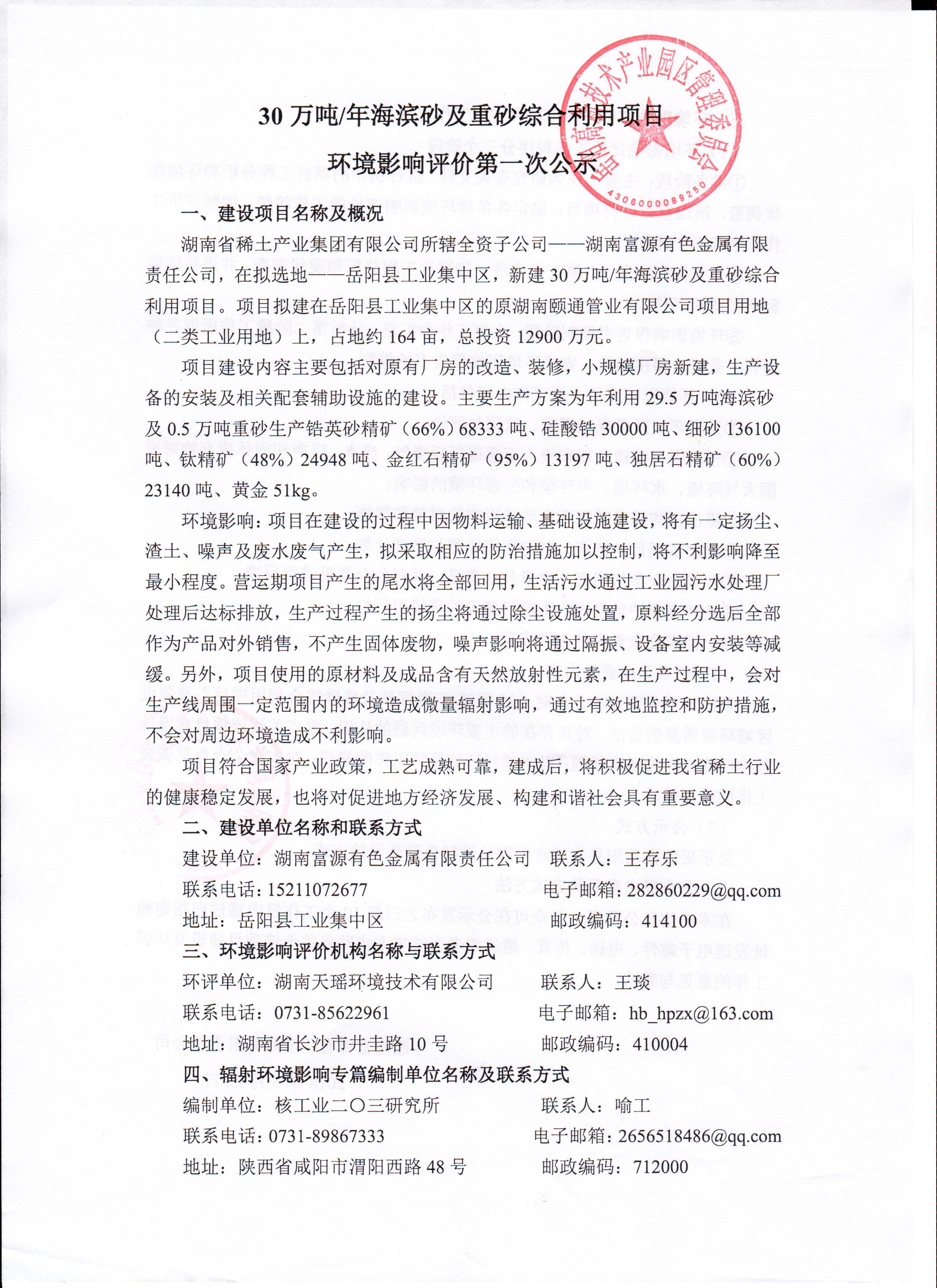 30万吨/年海滨砂及重砂综合利用项目环境影响评价第一次公示