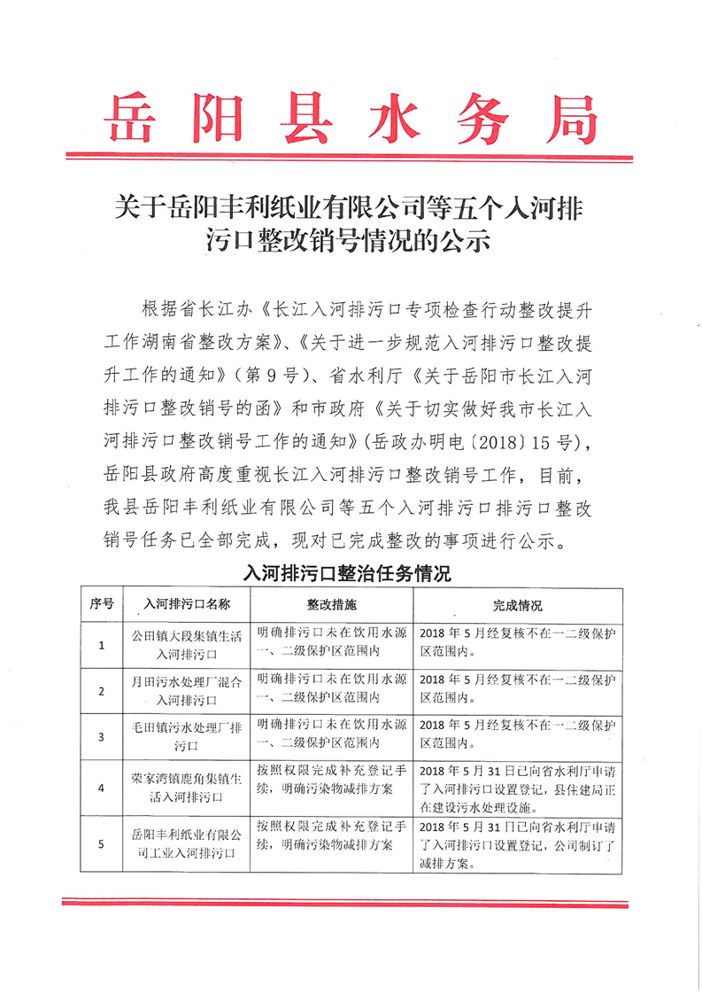 关于岳阳丰利纸业有限公司等五个入河排污口整改销号情况的公示