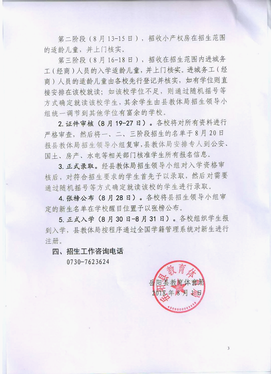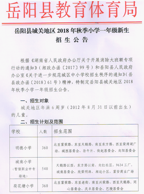 岳阳县城关地区2018年秋季小学一年级新生招生公告