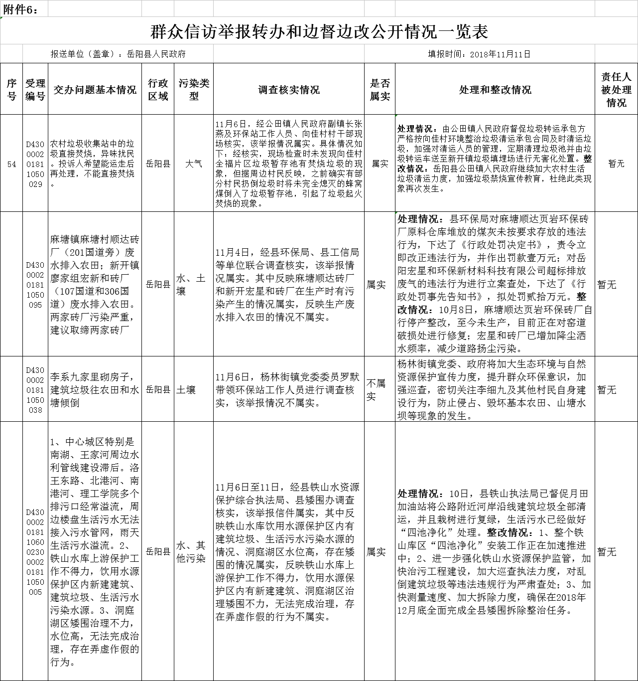 中央生态环境保护督察“回头看”群众信访举报转办和边督边改公开情况一览表 (2018年11月11日)