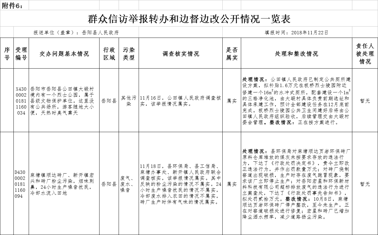 中央生态环境保护督察“回头看”群众信访举报转办和边督边改公开情况一览表 (2018年11月22日)