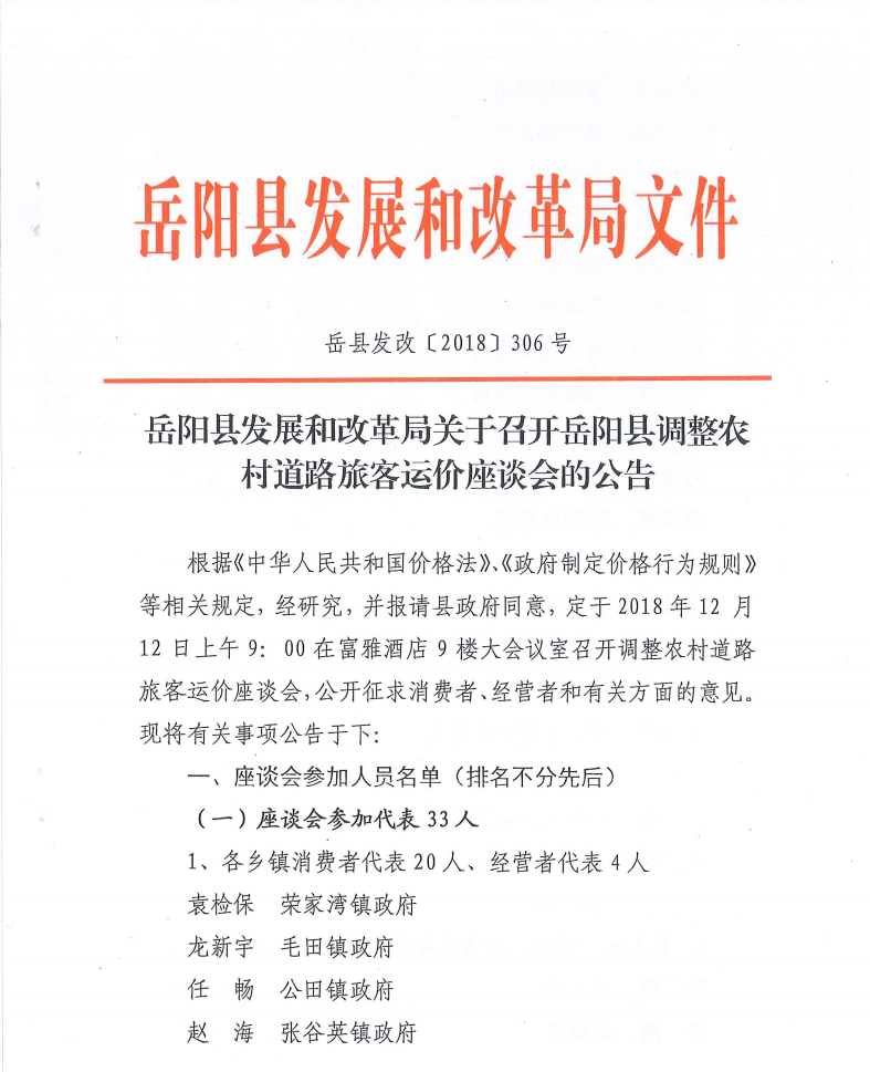 关于召开岳阳县调整农村道路旅客运价座谈会的公告