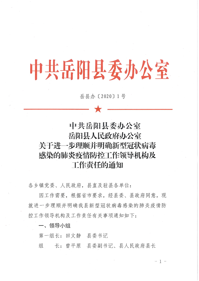 关于进一步理顺并明确新型冠状病毒感染的肺炎疫情防控工作领导机构及工作责任的通知