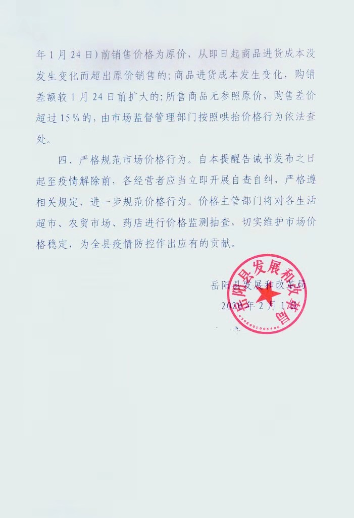 关于新型冠状病毒感染的肺炎疫情防控期间市场价格提醒告诫函