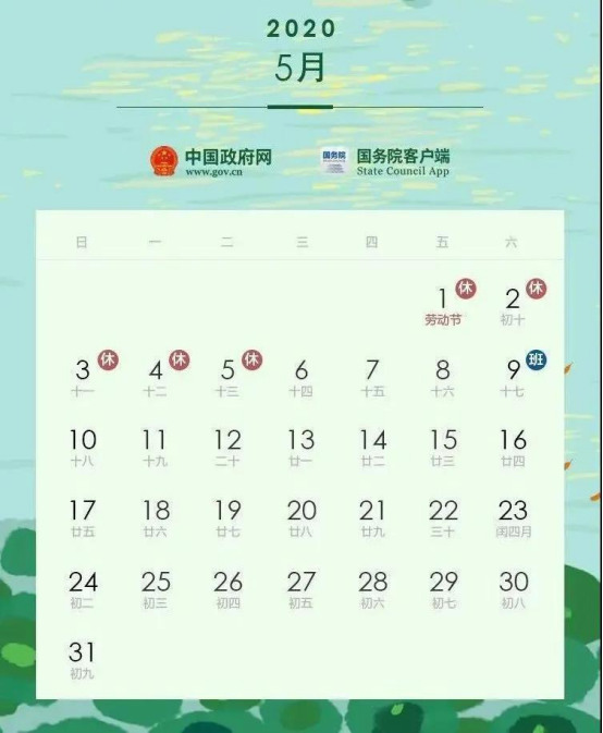 根据国务院办公厅《关于2020年部分节假日安排的通知》,现将县政务服务中心政务大厅“五一”期间放假安排通知如下: 5月1日(星期五)至5月5日(星期二)放假,共5天;4月26日(星期日),5月9日(星期六)上班。请广大人民群众合理安排办事时间,放假期间政务大厅各窗口不对外办公。