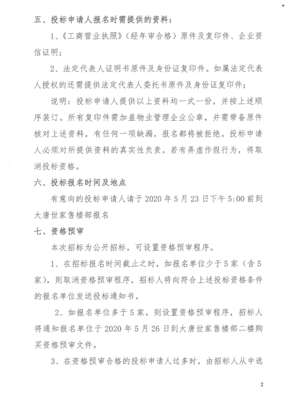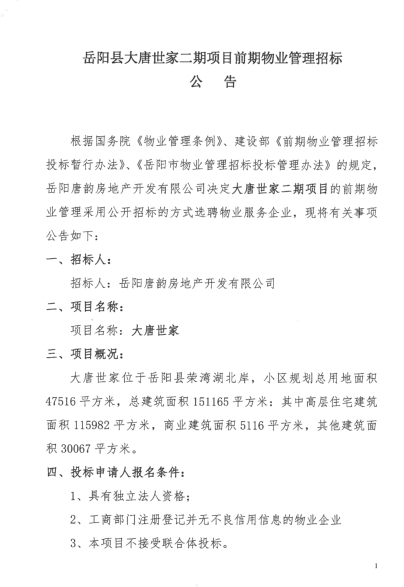 根据住建部《前期物业管理招标投标管理暂行办法》等有关规定,岳阳唐韵房地产开发有限公司开发的岳阳县大唐世家二期项目,对前期物业管理采取公开招标方式进行招标,我局根据住建部《前期物业管理招标投标管理暂行办法》等文件中有关前期物业管理招标投标的规定,对招标文件进行网上公开公示。