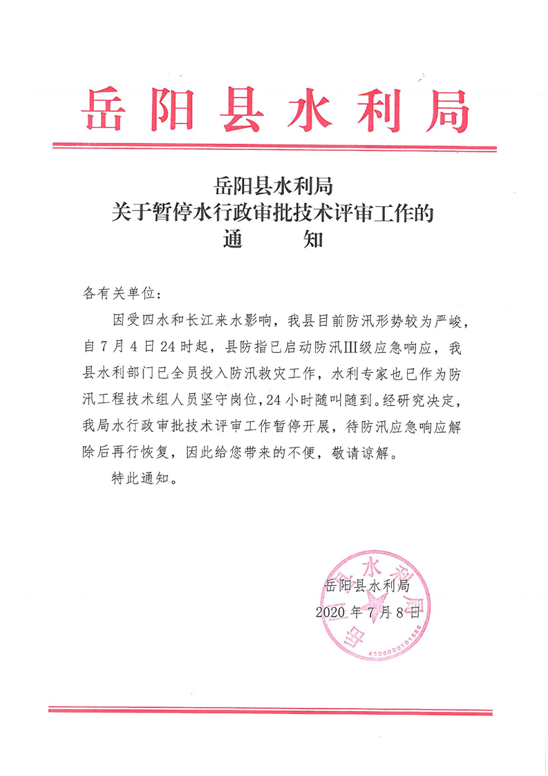 岳阳县水利局关于暂停水行政审批技术评审工作的通知