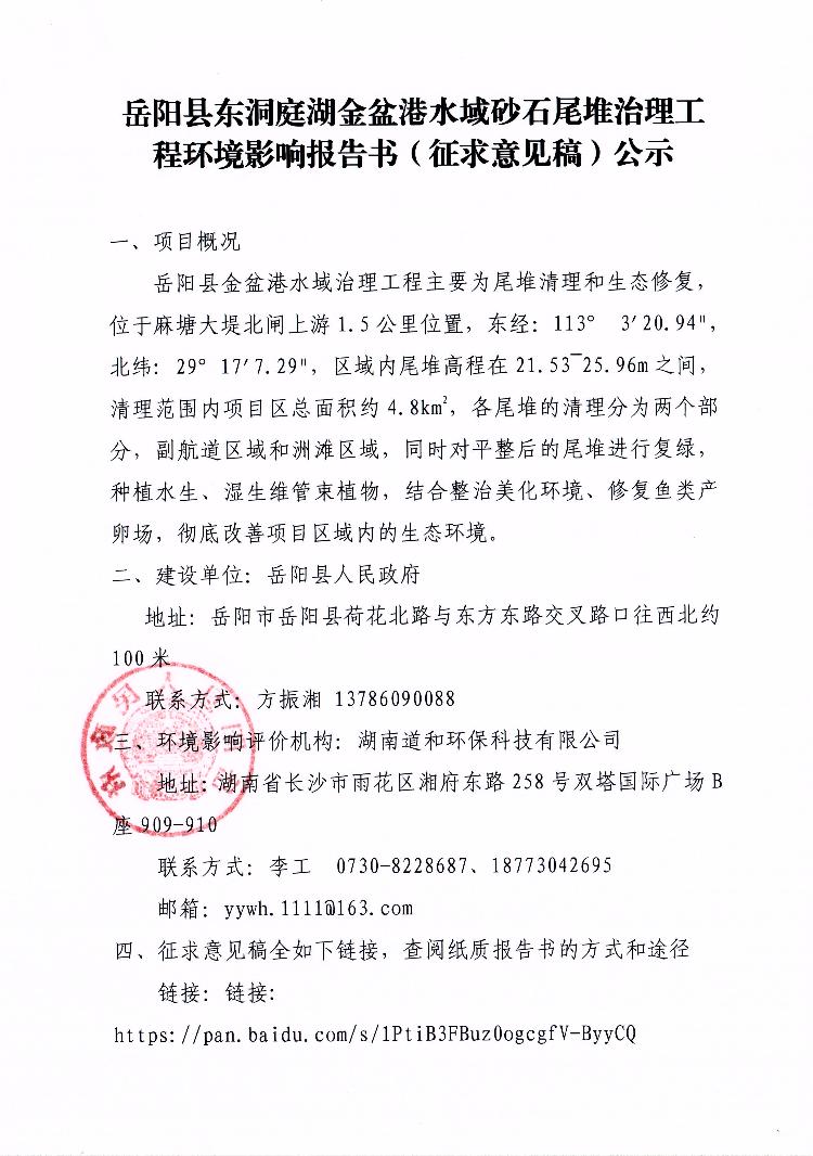 岳阳县东洞庭湖金盆港水域砂石尾堆治理工程环境影响报告书(征求意见稿)公示