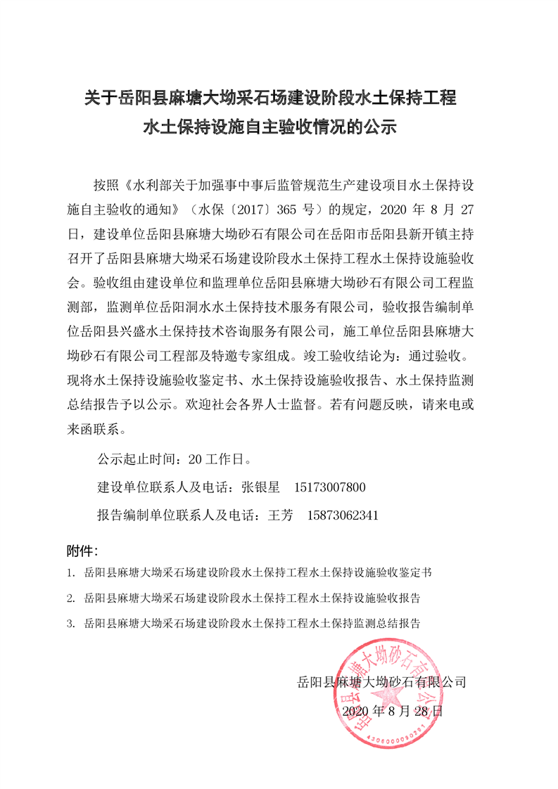关于岳阳县麻塘大坳采石场建设阶段水土保持工程水土保持设施自主验收情况的公示