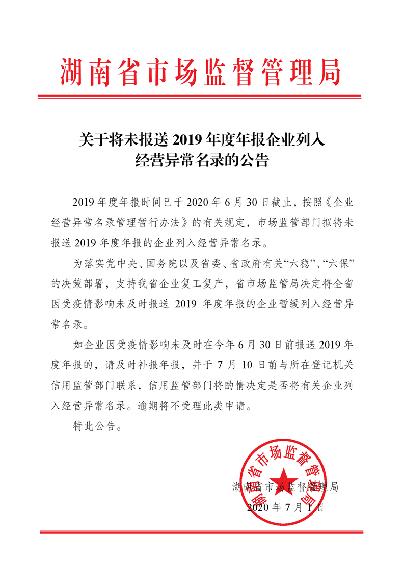 关于将未报送2019 年度年报企业列入经营异常名录的公告
