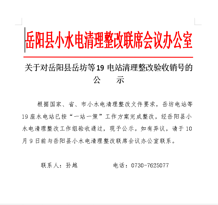 关于对岳阳县岳坊等19座水电站清理整改验收销号的公示