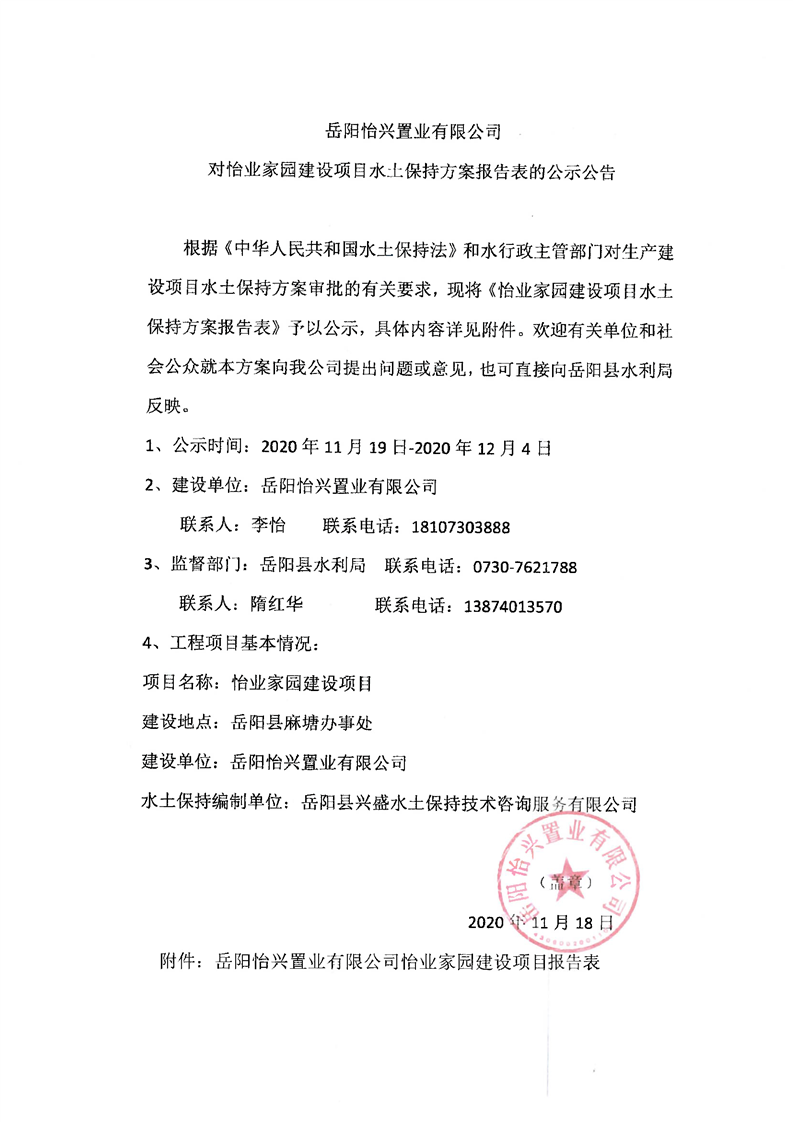岳阳怡兴置业有限公司对怡兴家园建设项目水土保持方案的公示