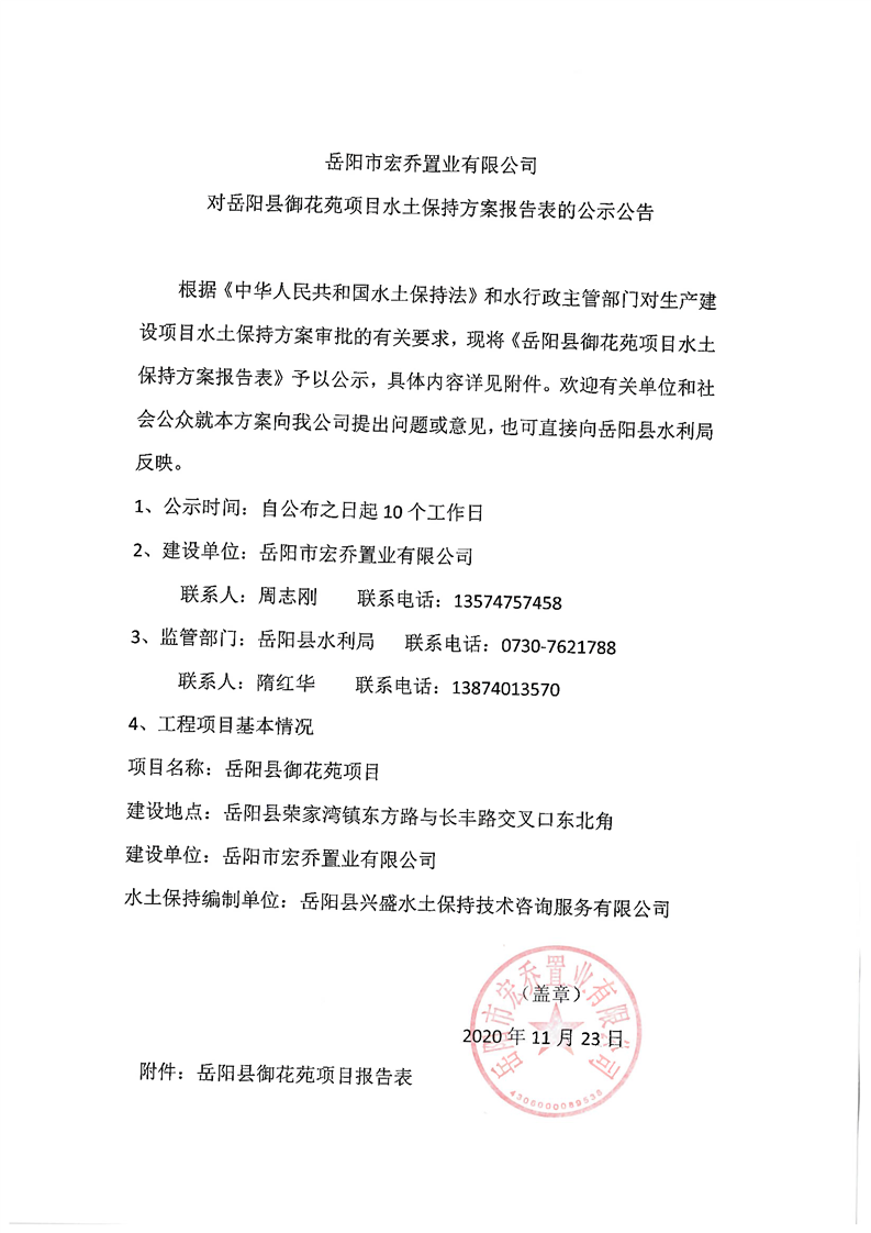 岳阳市宏乔置业有限公司对岳阳县御花苑项目水土保持方案的公示