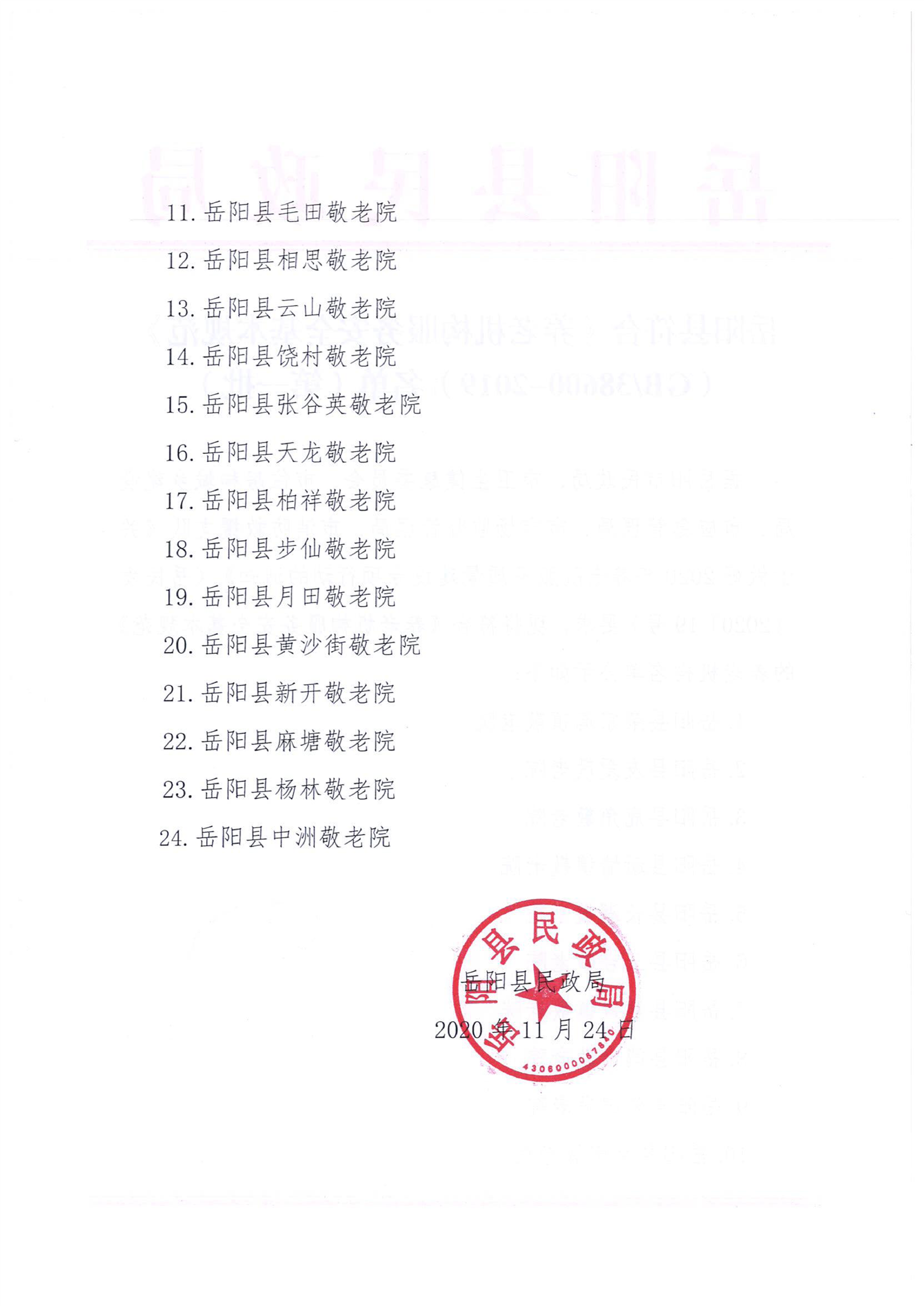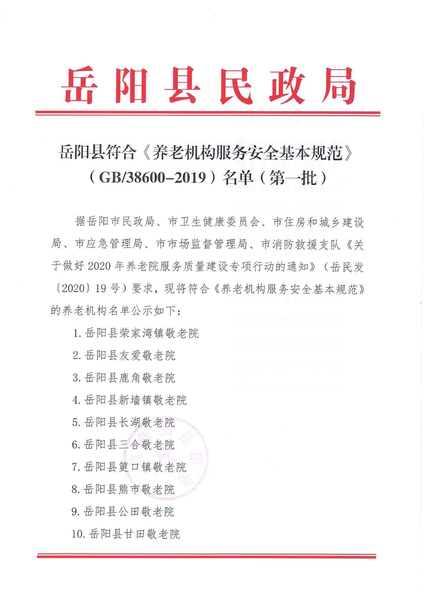 岳阳县符合《养老机构服务安全基本规范》(GB/38600-2019)名单(第一批)