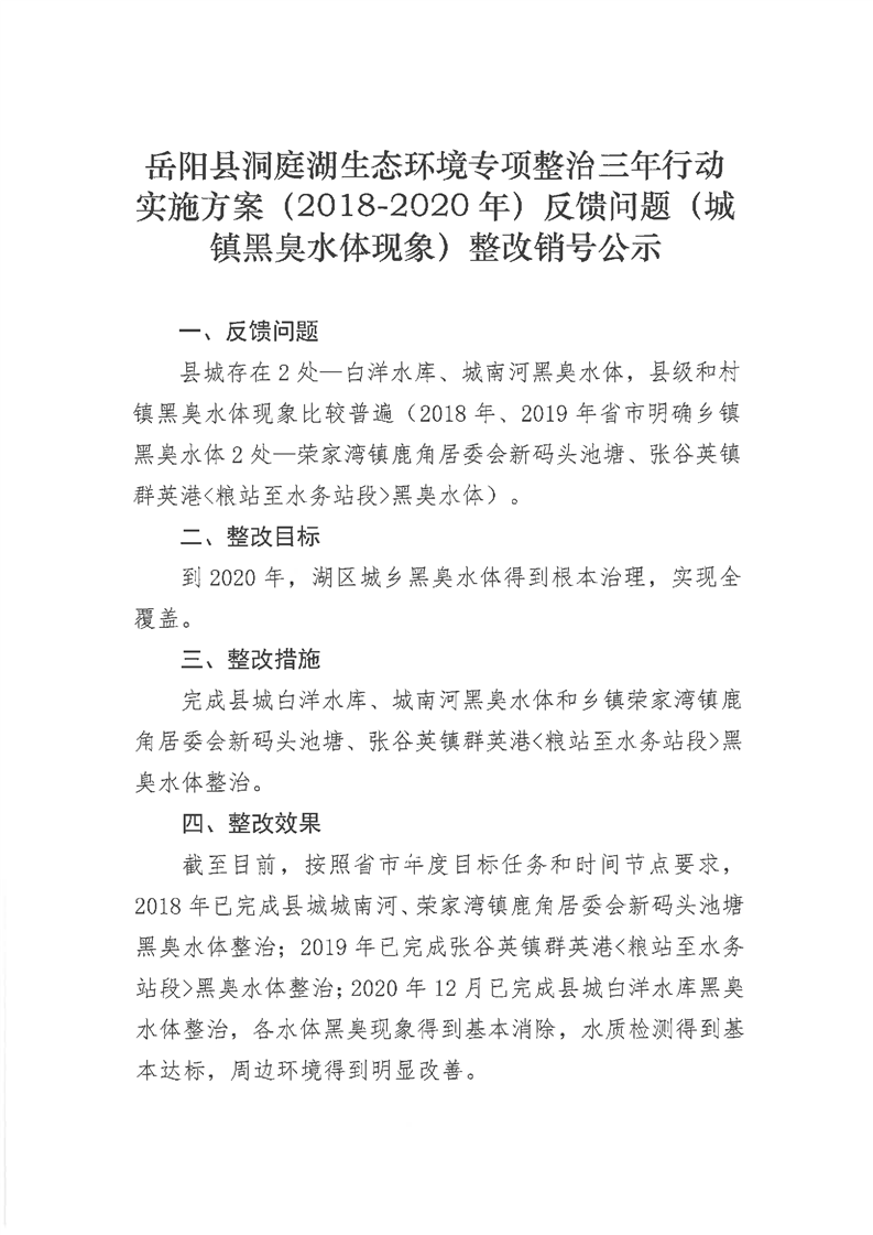 岳阳县洞庭湖生态环境专项整治三年行动实施方案(2018-2020年)反馈问题(城镇黑臭水体现象)整改销号