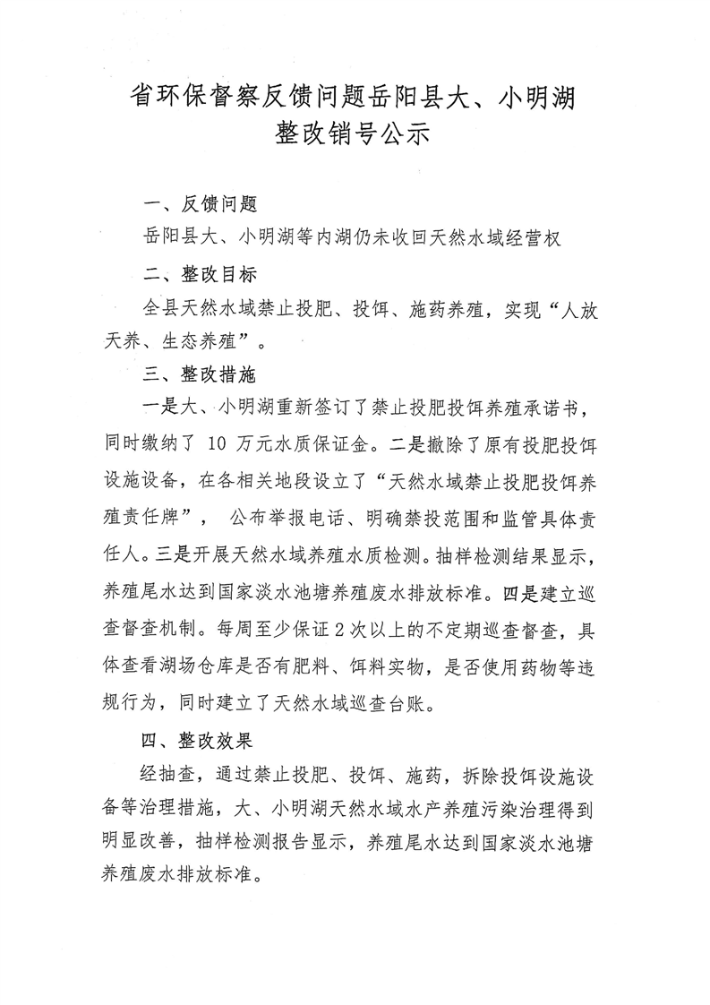省环保督察反馈问题岳阳县大、小明湖整改销号公示
