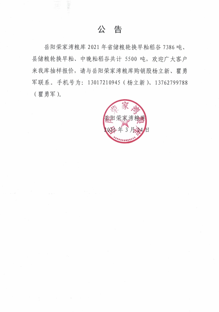 关于荣家湾粮库省级储备粮、县级储备粮销售出库的公告