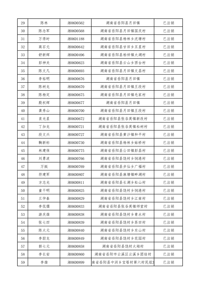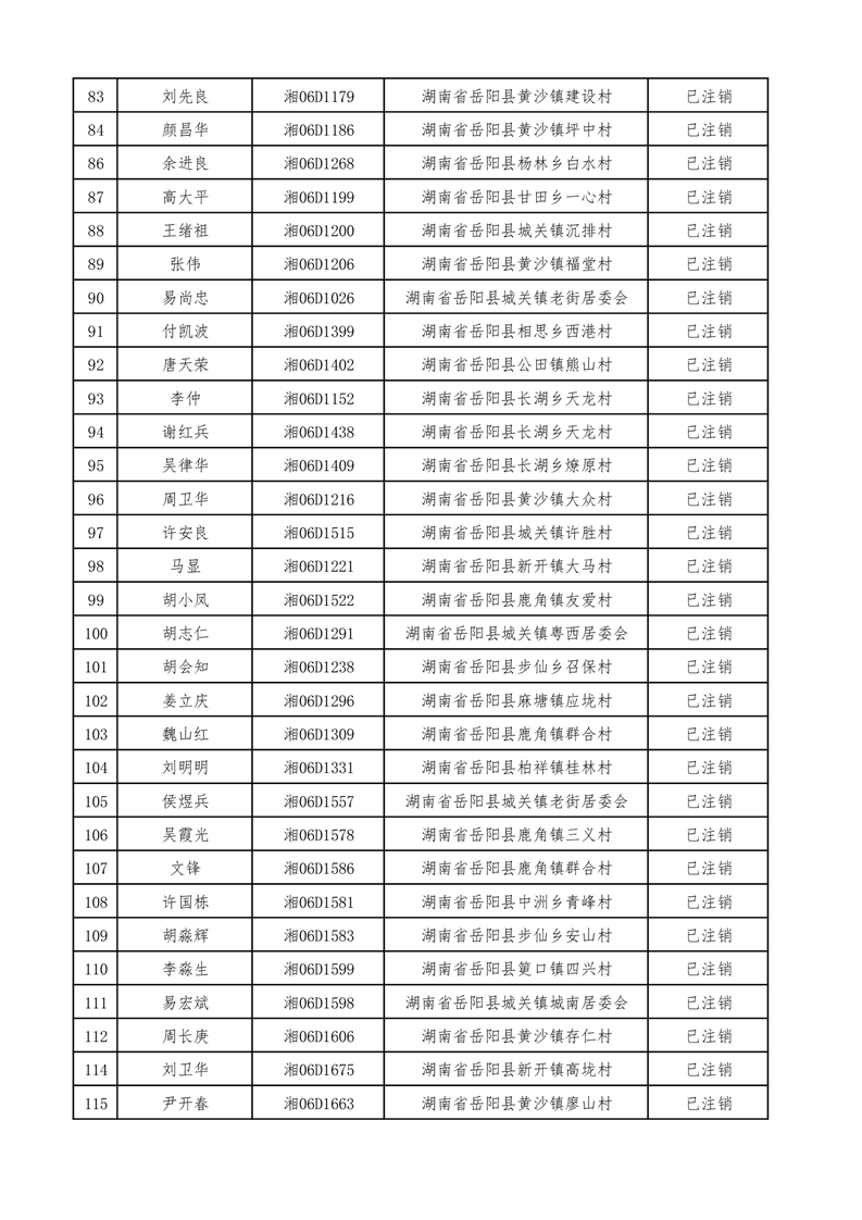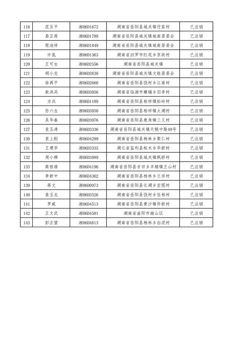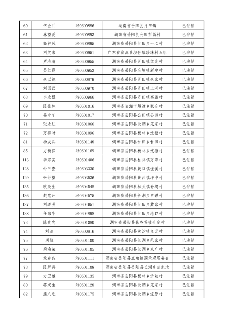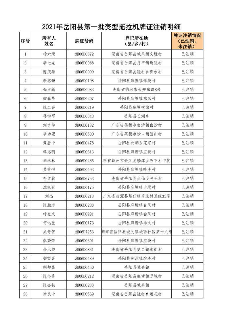 按照《拖拉机登记规定》、《拖拉机禁用与报废》(GB/T16877-2008)及《机动车强制报废标准》和湖南省农机局《关于开展报废、灭失、和长期脱检拖拉机专项清查并实施注销登记的通知》(湘农机发〔2017〕18号)文件要求,对全县各乡镇(办事处)辖区内变型拖拉机达到报废状态并连续三年未检验的变型拖拉机进行注销登记,现有143台变型拖拉机牌、证已经注销,现予以公告。