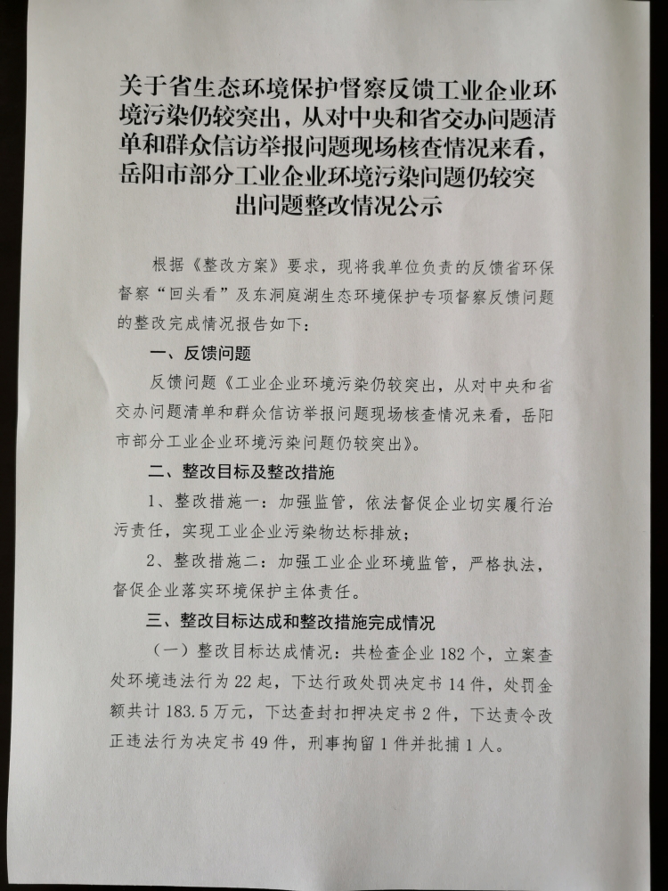 关于省生态环境保护督察反馈工业企业环境污染仍较突出,从对中央和省交办问题清单和群众信访举报问题现场核查情况来看,岳阳市部分工业企业环境污染问题仍较突出问题整改情况公示