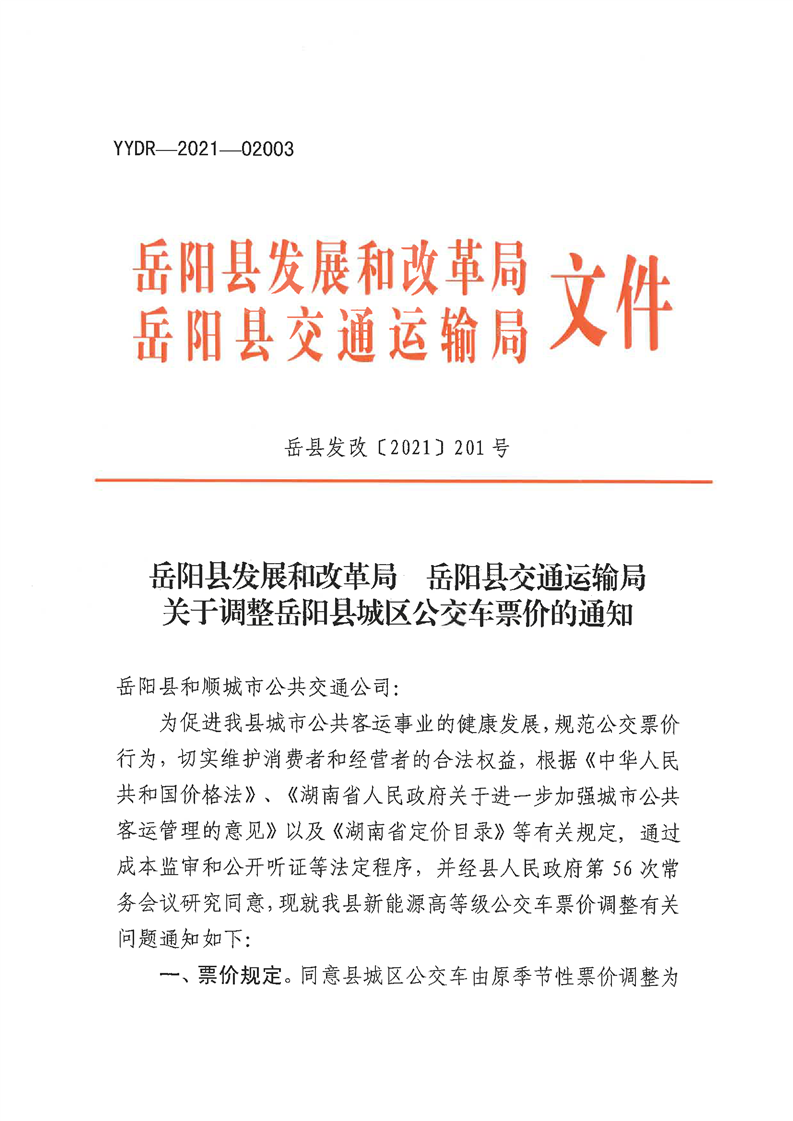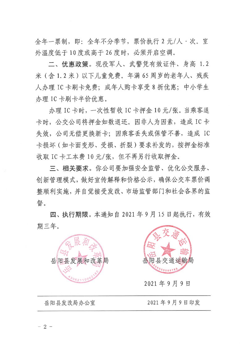 关于调整岳阳县城区公交车票价的通知