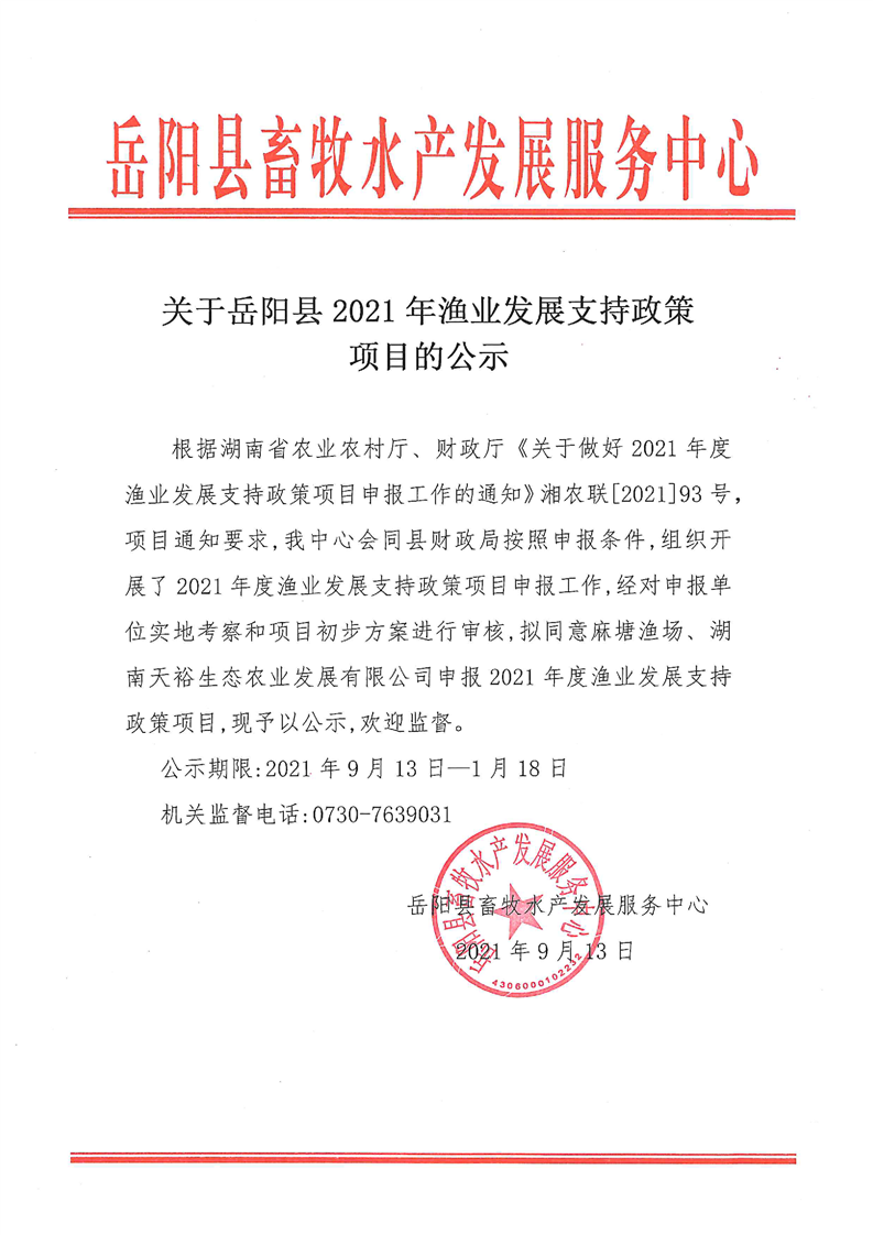 关于岳阳县2021年渔业发展支持政策项目的公示