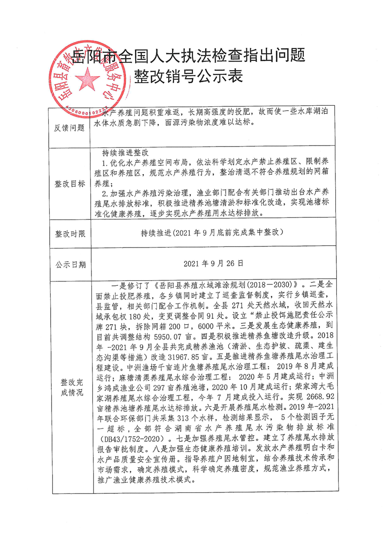 岳阳市全国人大执法检查指出问题整改销号公示表