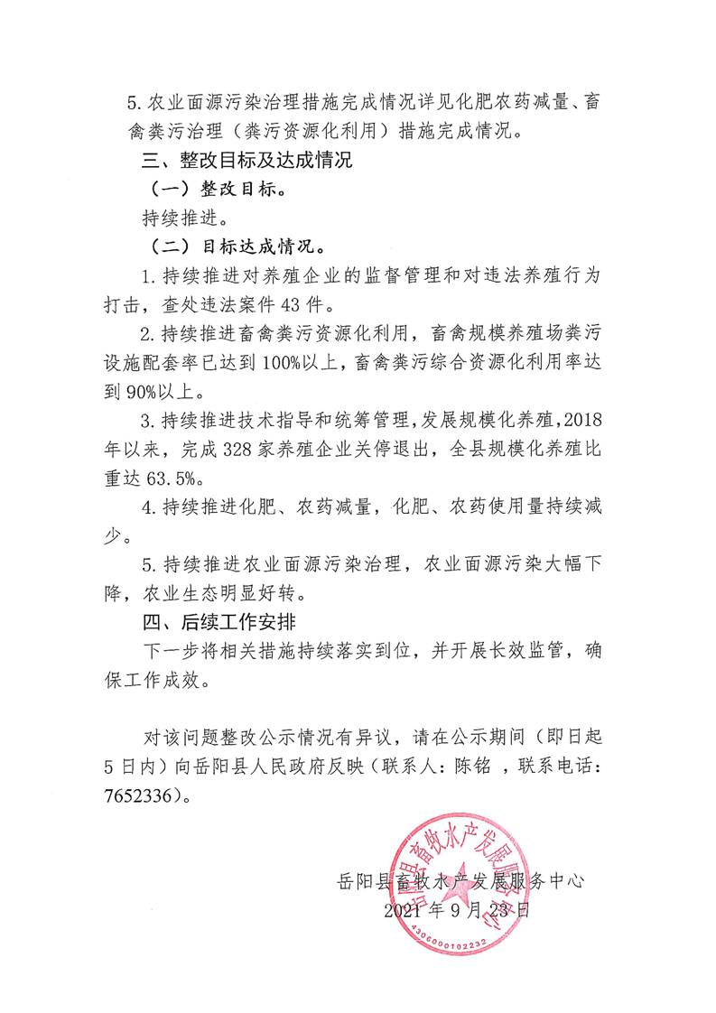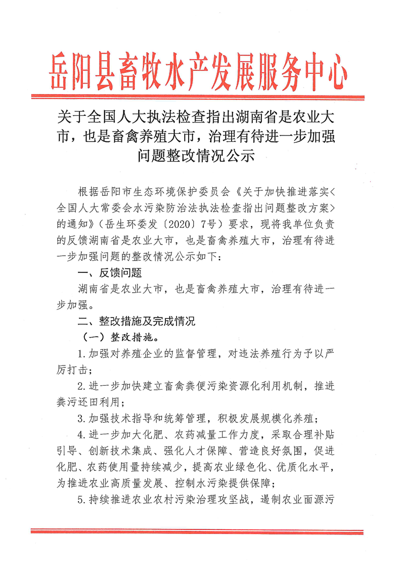 关于全国人大执法检查指出湖南省是农业大市,也是畜禽养殖大市,治理有待进一步加强问题整改情况公示