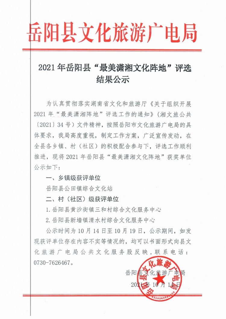 2021年岳阳县“最美潇湘文化阵地”评选结果公示