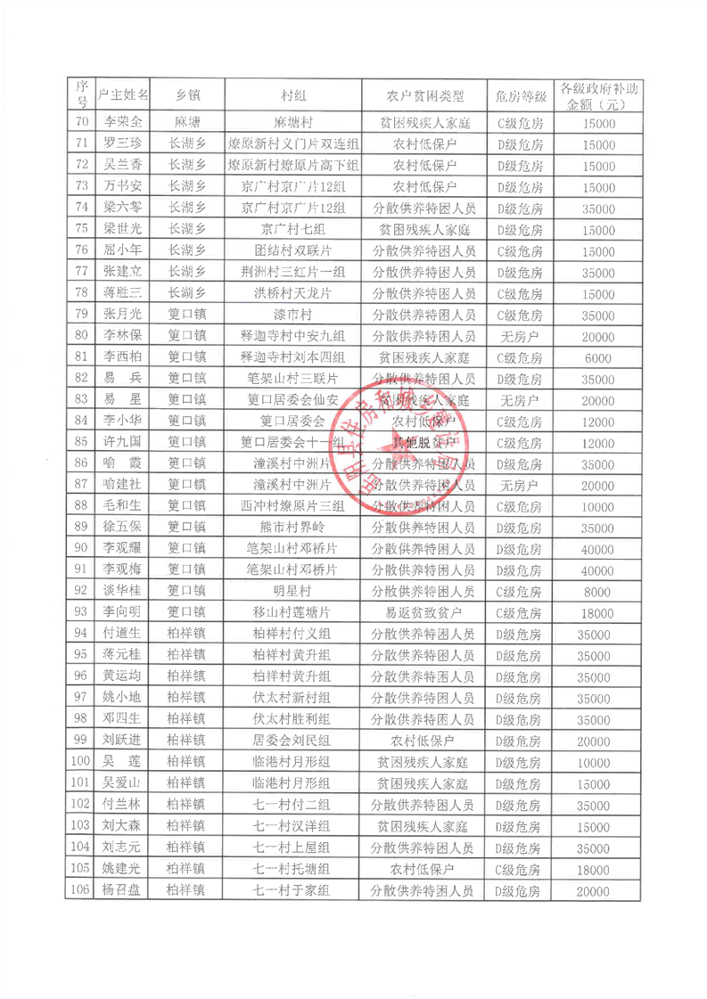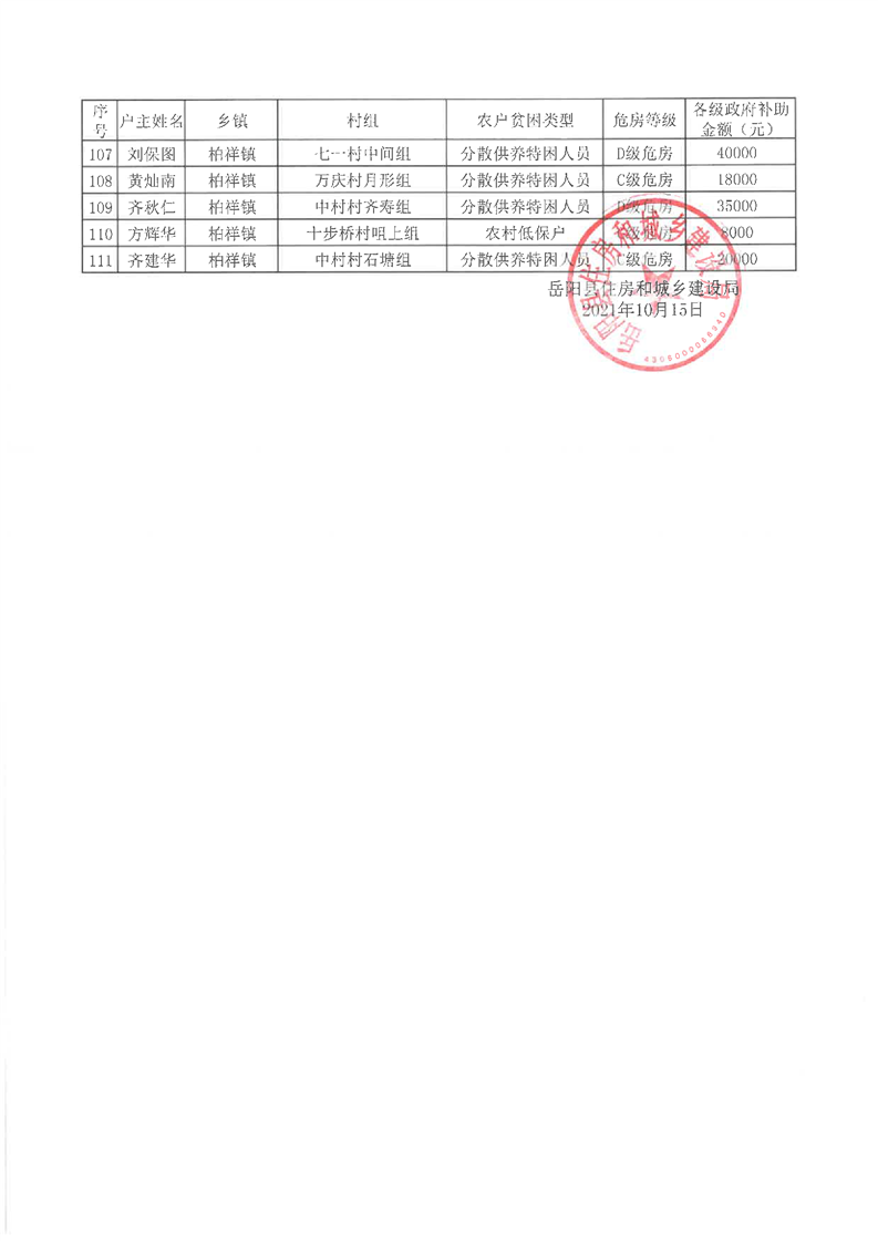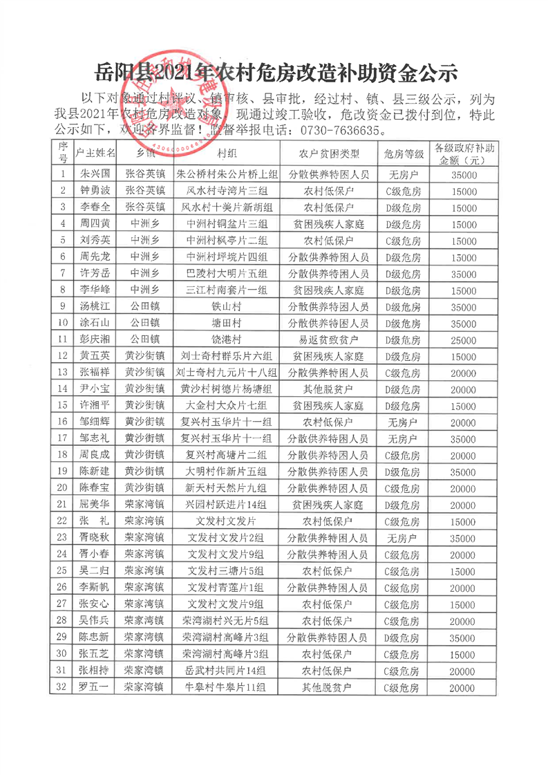 岳阳县2021年农村危房改造补助资金公示