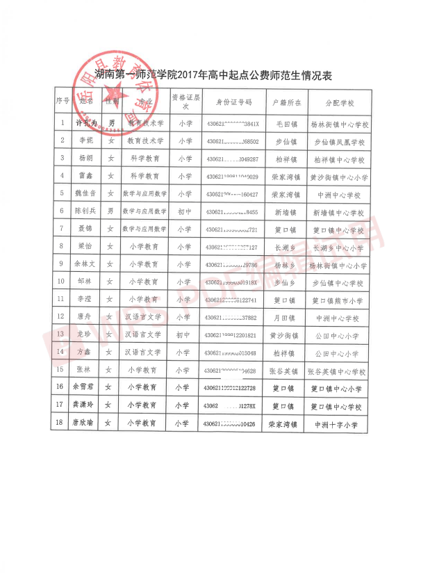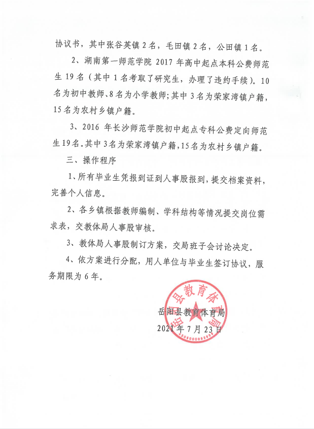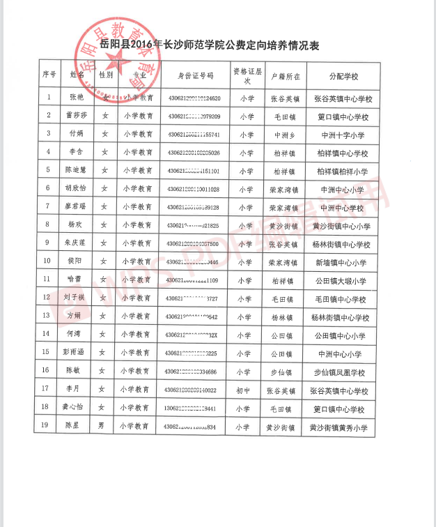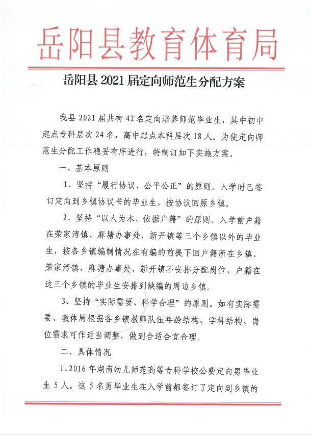 现将岳阳县2021年公费定向培养师范生分配情况予以公示,接受社会、群众监督。