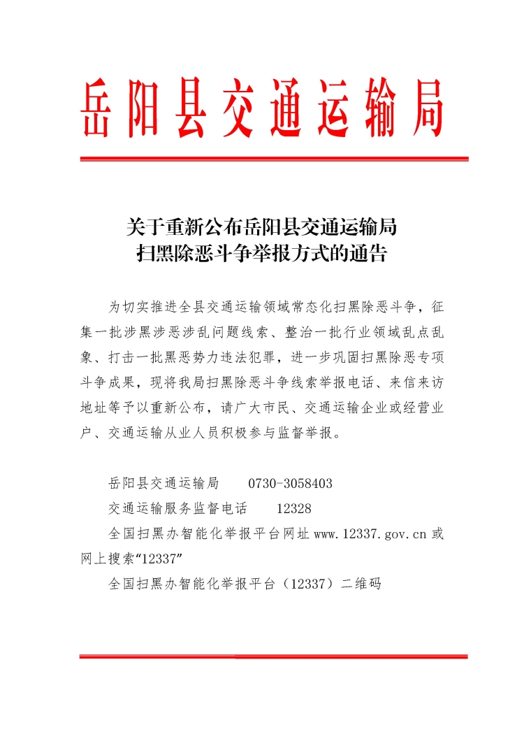 关于重新公布岳阳县交通运输局扫黑除恶斗争举报方式的通告