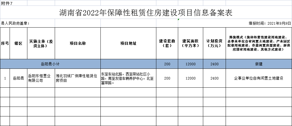 岳阳县2022年保障性租赁住房建设项目信息备案表